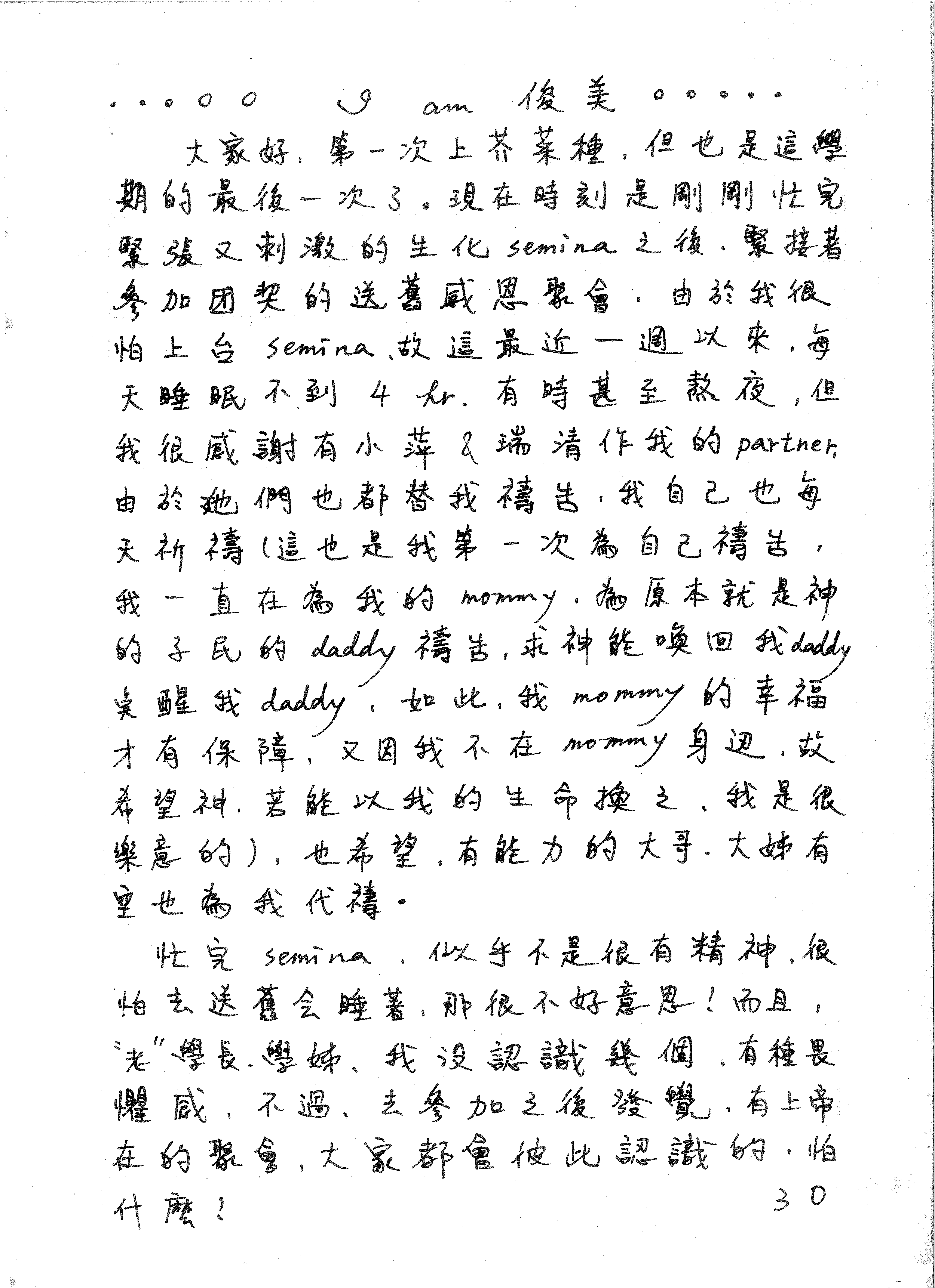 大家好,第一次上芥菜種,但也是這學期的最後一次了。現在時刻是剛剛忙完緊張又刺激的生化 semina 之後,緊接著參加團契的送舊感恩聚會,由於我很怕上台 semina,故這最近一週以來,每天睡眠不到 4 hr. 有時甚至熬夜,但我很感謝有小萍 & 瑞清作我的 partner,由於她們也都替我禱告,我自己也每天祈禱 (這也是我第一次為自己禱告,我一直在為我的 mommy,為原本就是神的子民的 daddy 禱告,求神能喚回我 daddy 笑[插入: 喚]醒我 daddy,如此,我 mommy 的幸福才有保障,又因我不在 mommy 身邊,故希望神,若能以我的生命換之,我是很樂意的),也希望,有能力的大哥、大姊有空也為我代禱。