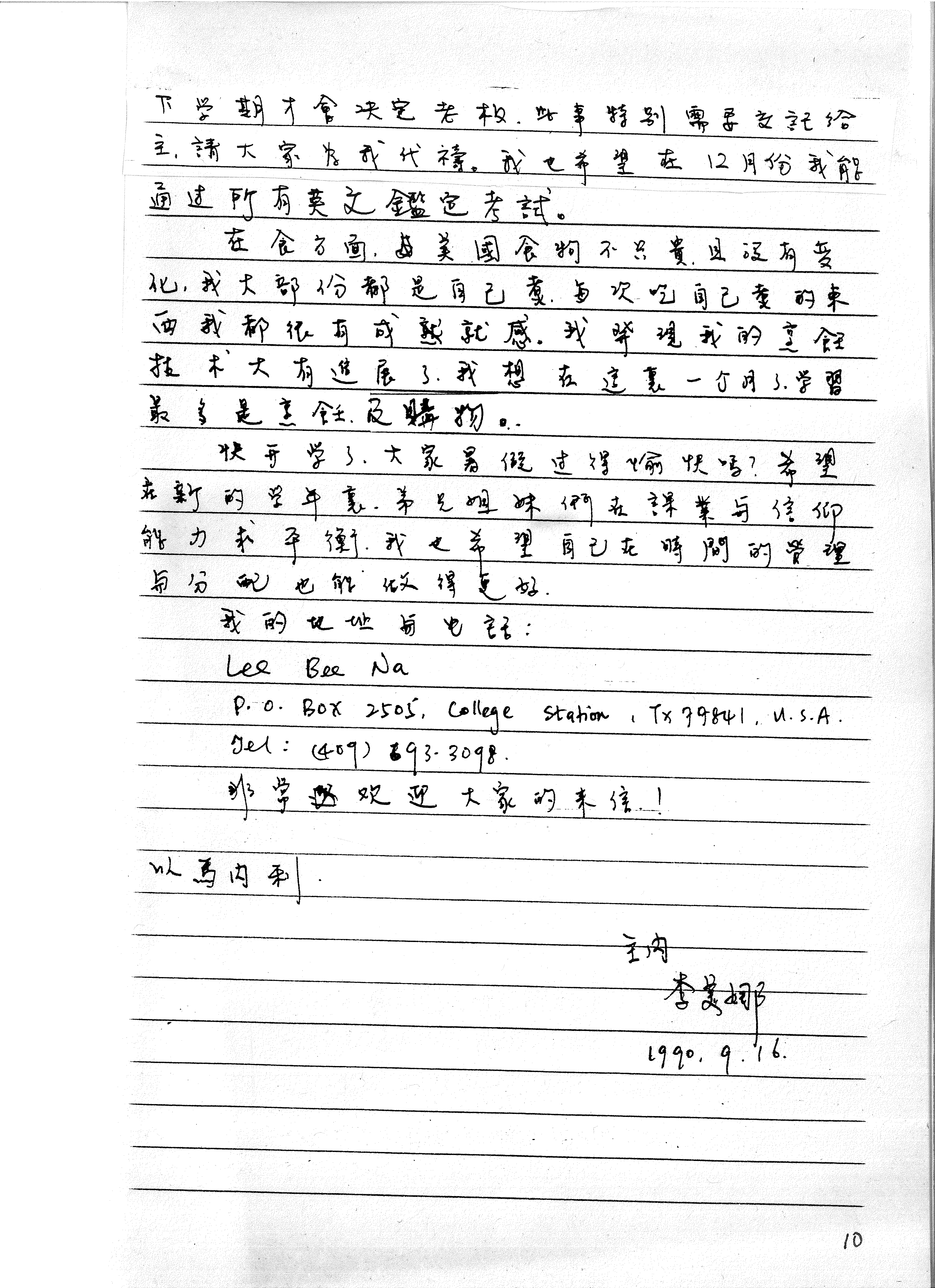 我的地址電話: Lee Bee Na P.O. BOX 2505, College Station, Tx 77841. U.S.A. Tel: (409) 693-3098. 非常歡迎大家的來信!