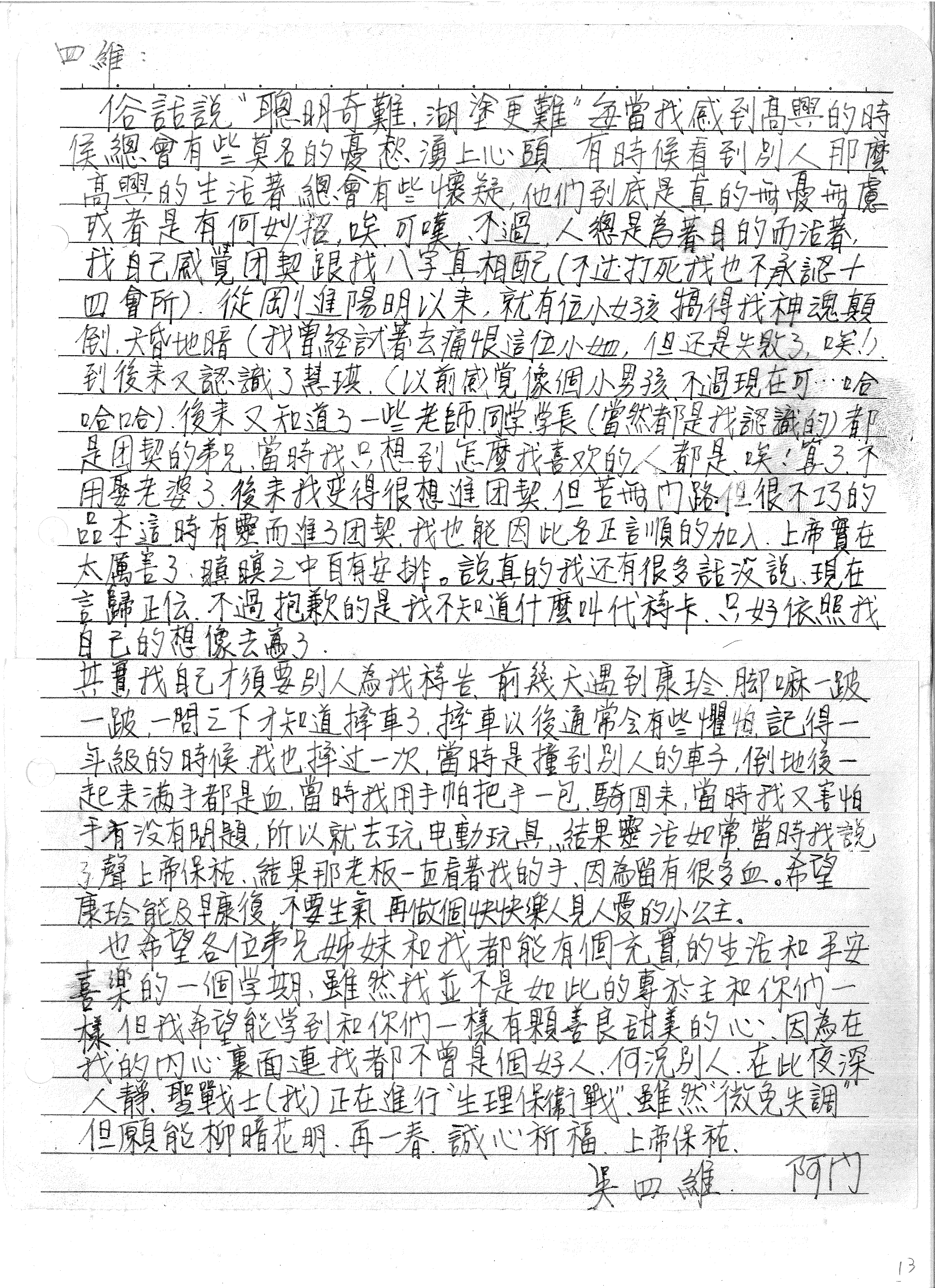 俗話說“聰明奇難,湖塗更難”。每當我感到高興的時侯總會有些莫名的憂愁湧上心頭,有時候看到別人那麼高興的生活著,總會有些懷疑,他們到底是眞的無憂無慮或者是有何妙招,唉可嘆,不過,人總是為著目的而活著,我自己感覺團契跟我八字真相配,(不過打死我也不承認十四會所)。從剛進陽明以來,就有位小女孩搞得我神魂顛倒,天昏地暗(我曾經試著去痛恨這位小姐,但還是失敗了,唉!)到後來又認識了慧琪。(以前感覺像個小男孩,不過現在可…哈哈哈)。後來又知道了一些老師、同學、學長(當然都是我認識的)都是團契的弟兄,當時我只想到怎麼我喜歡的人都是,唉!算了不用娶老婆了。後來我變得很想進團契,但苦無門路,但很不巧的是品本這時有靈而進了團契,我也能因此名正言順的加入,上帝實在太厲害了,瞋膜之中自有安排。說真的我還有很多話沒說,現在言歸正位,不過抱歉的是我不知道什麼叫代禱卡,只好依照我自己的想像去寫了。