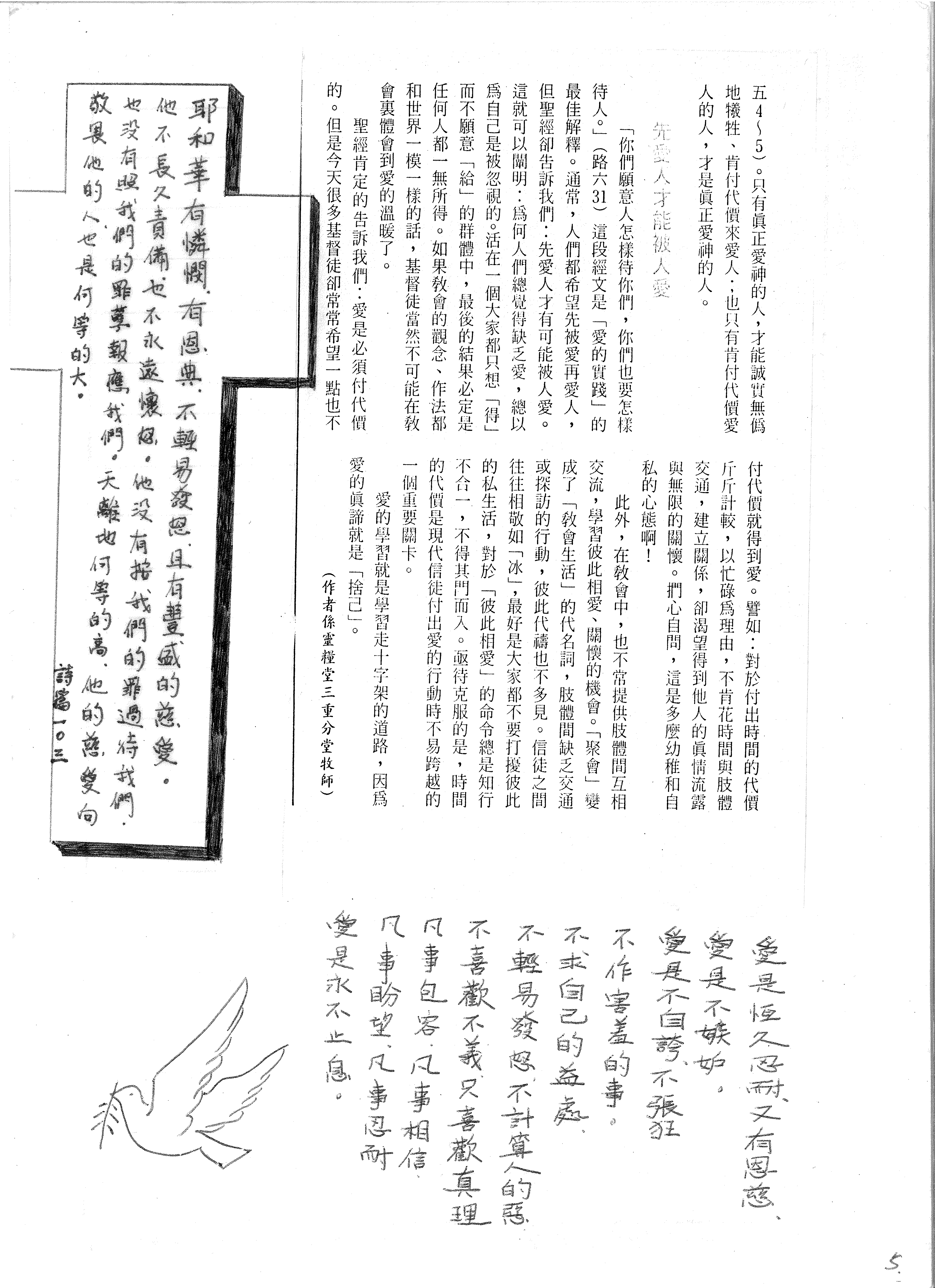 本頁文章探討愛的真諦與實踐,強調愛神的人必須誠實無偽地犧牲並愛人,並指出人們常希望先被愛再愛人,但聖經教導要先愛人才能被愛。文章批評基督徒在教會生活中不願付出時間與肢體交通,卻渴望得到關懷,並引用聖經經文闡述神的慈愛和愛的特質。
