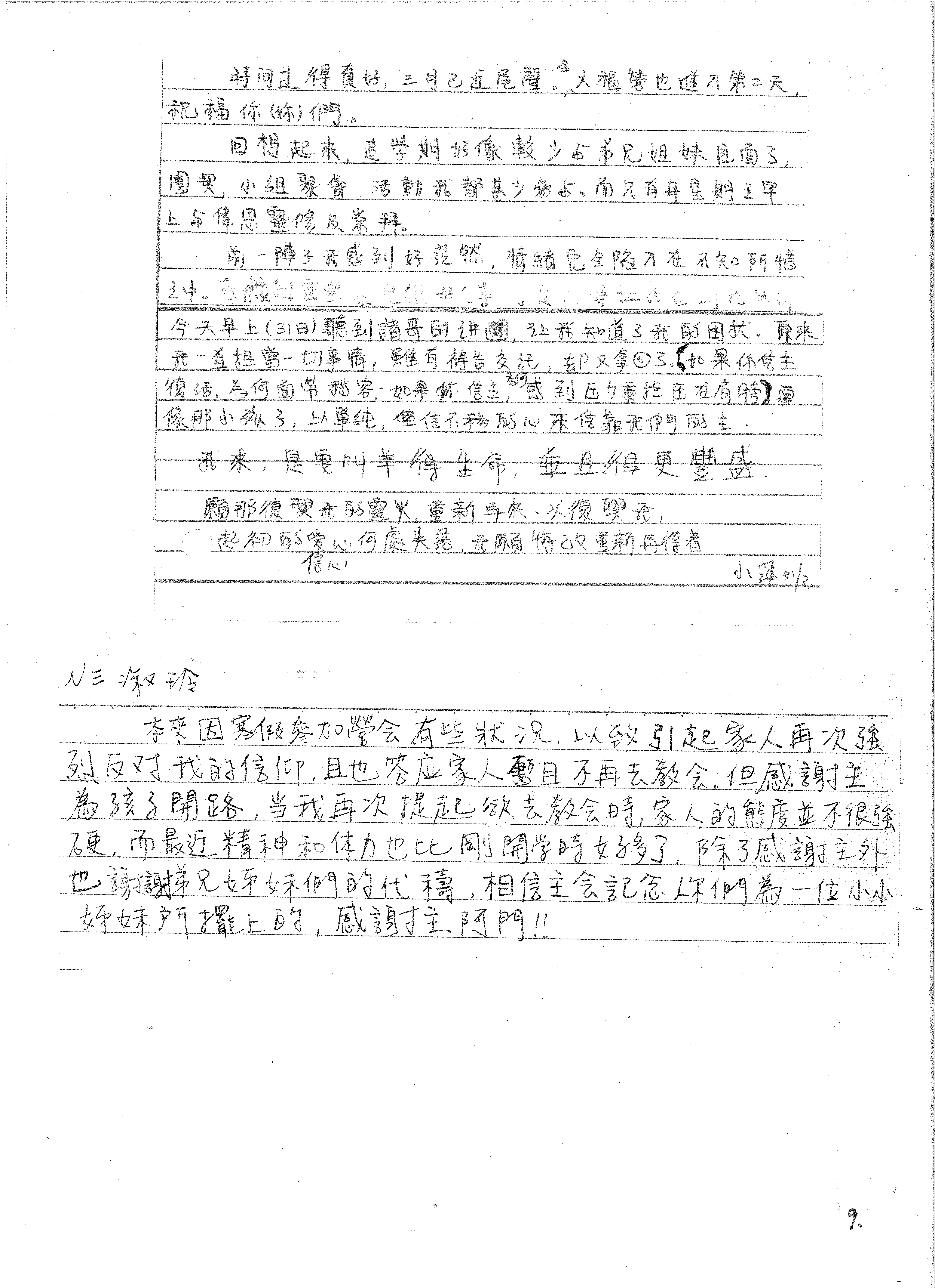 N三 淑玲 本來因寒假參加營會有些狀況,以致引起家人再次強 烈反對我的信仰,且也答應家人暫且不再去教會。但感謝主 為孩子開路,當我再次提起欲去教會時,家人的態度並不很強 硬,而最近精神和體力也比剛開學時好多了,除了感謝主外 也謝謝弟兄姊妹們的代禱,相信主會記念你們為一位小小 姊妹所擺上的,感謝主,阿門!!