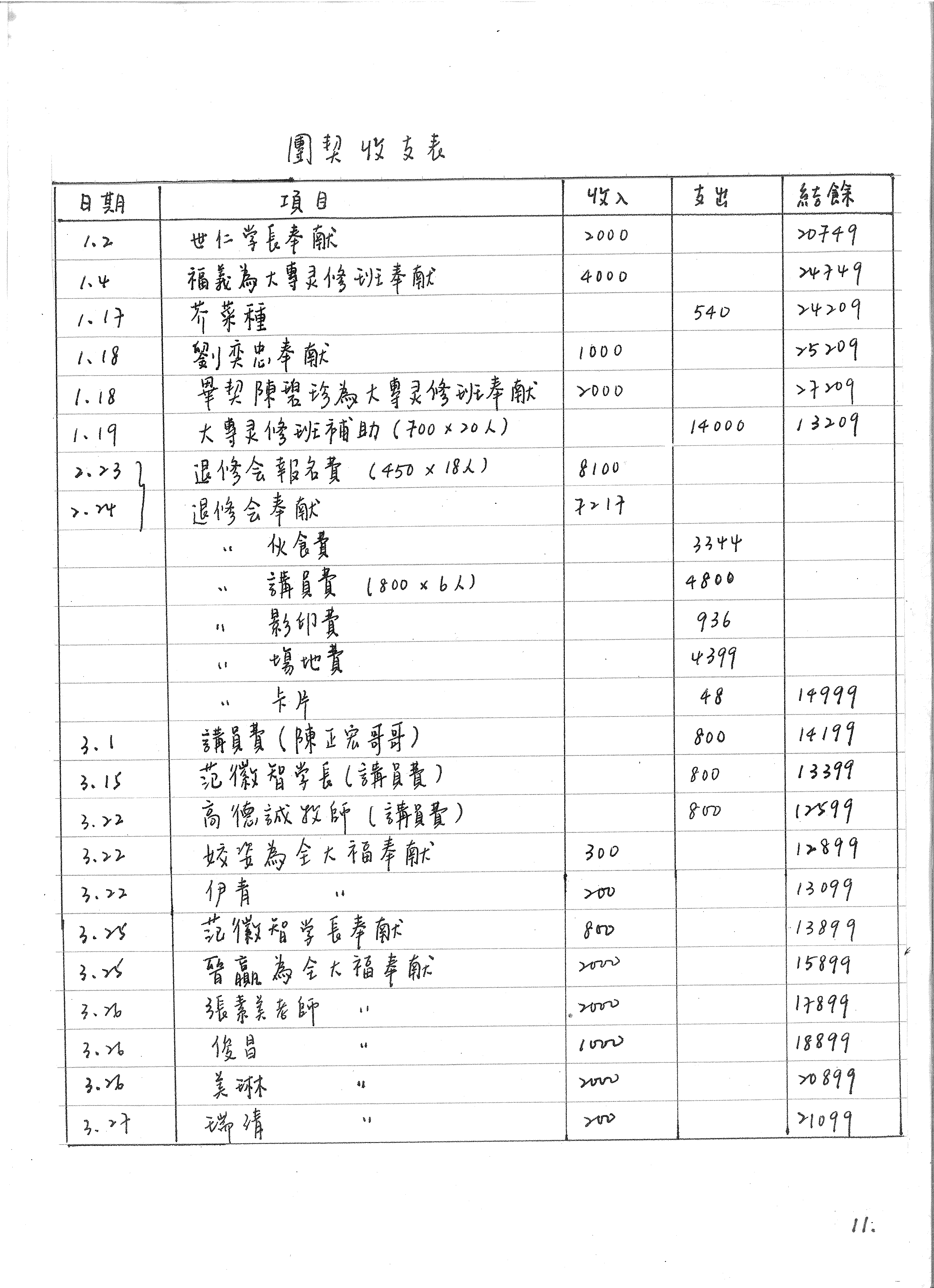 此頁為團契的收支表,詳細記錄了從1月2日至3月27日的各項收入與支出。收入主要來自個人奉獻,支出則包括芥菜種訂閱費、大專靈修班補助、退修會相關費用(伙食費、講員費、影印費、場地費、卡片)以及多位講員的費用。