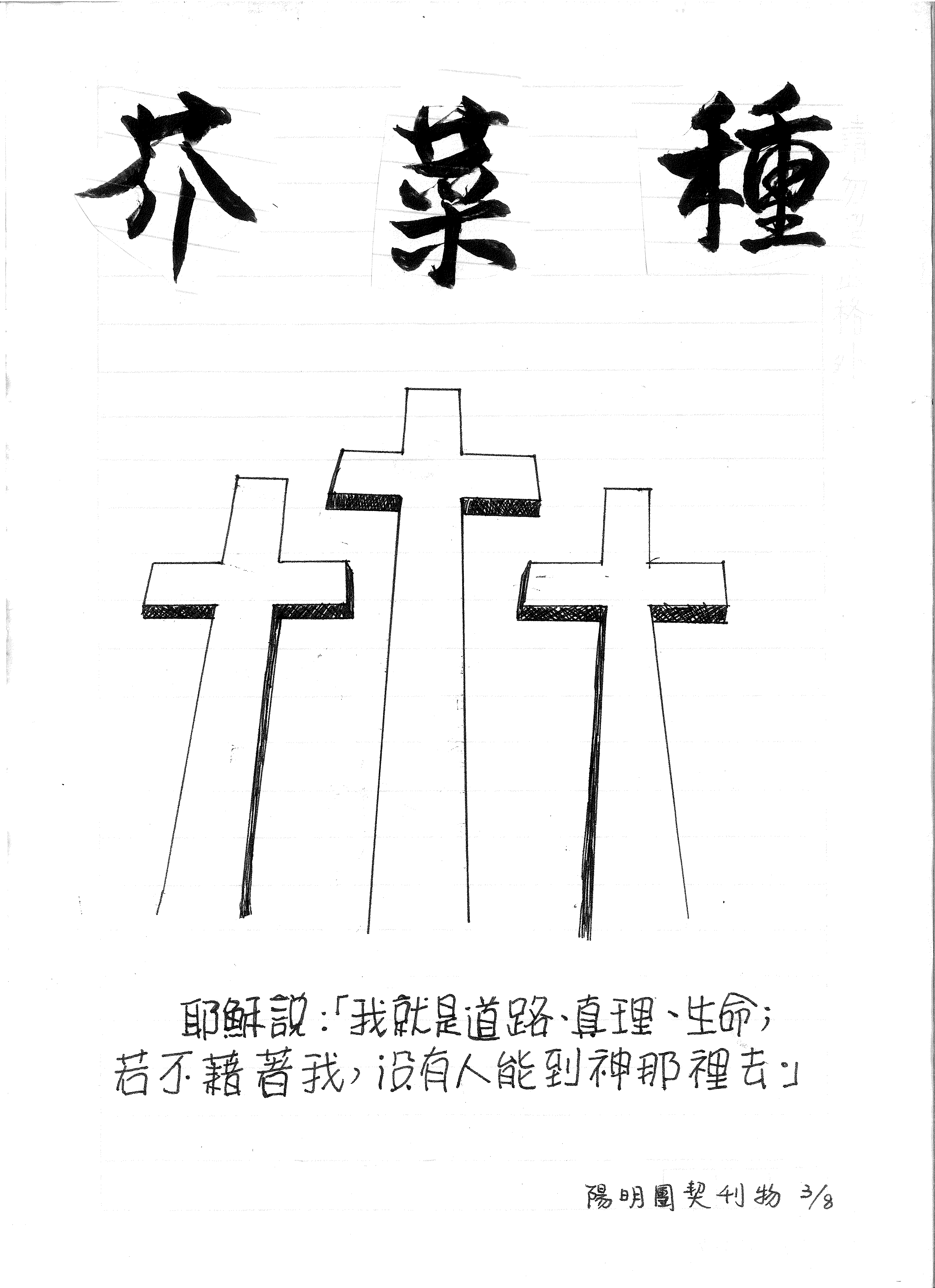 此頁為陽明團契刊物「芥菜種」的一部分,頁面包含一張三座十字架的圖片,並引用了耶穌關於道路、真理、生命的經文。