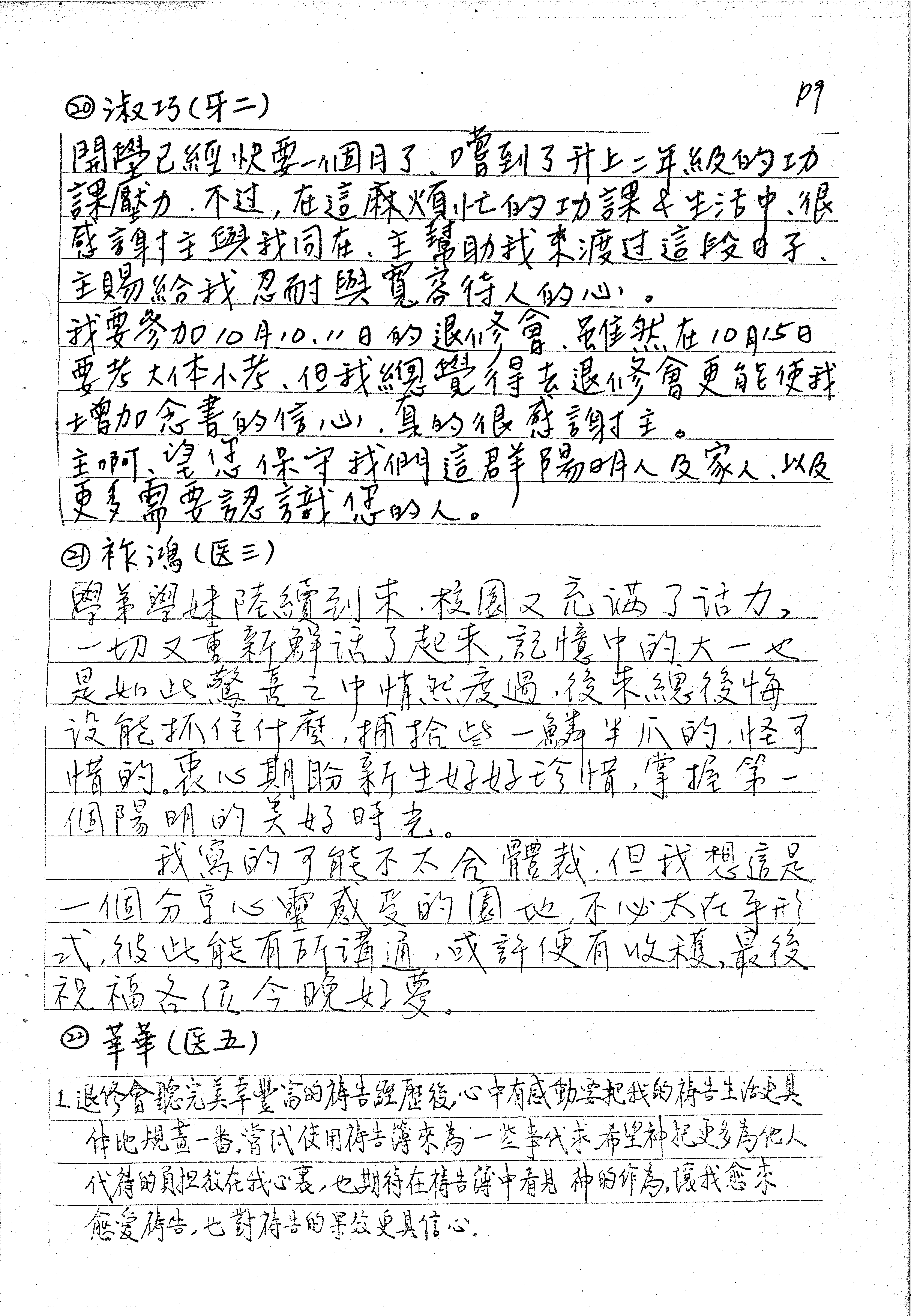 ⑳ 淑巧 (牙二) 開學已經快要一個月了,嚐到了升上二年級的功課壓力。不過,在這麻煩忙的功課&生活中,很感謝主與我同在、主幫助我來渡過這段日子、主賜給我忍耐與寬容待人的心。 我要參加10月10、11日的退修會,雖然在10月15日要考大体小考,但我總覺得去退修會更能使我增加念書的信心,真的很感謝主。 主啊,望您保守我們這群陽明人及家人,以及更多需要認識您的人。