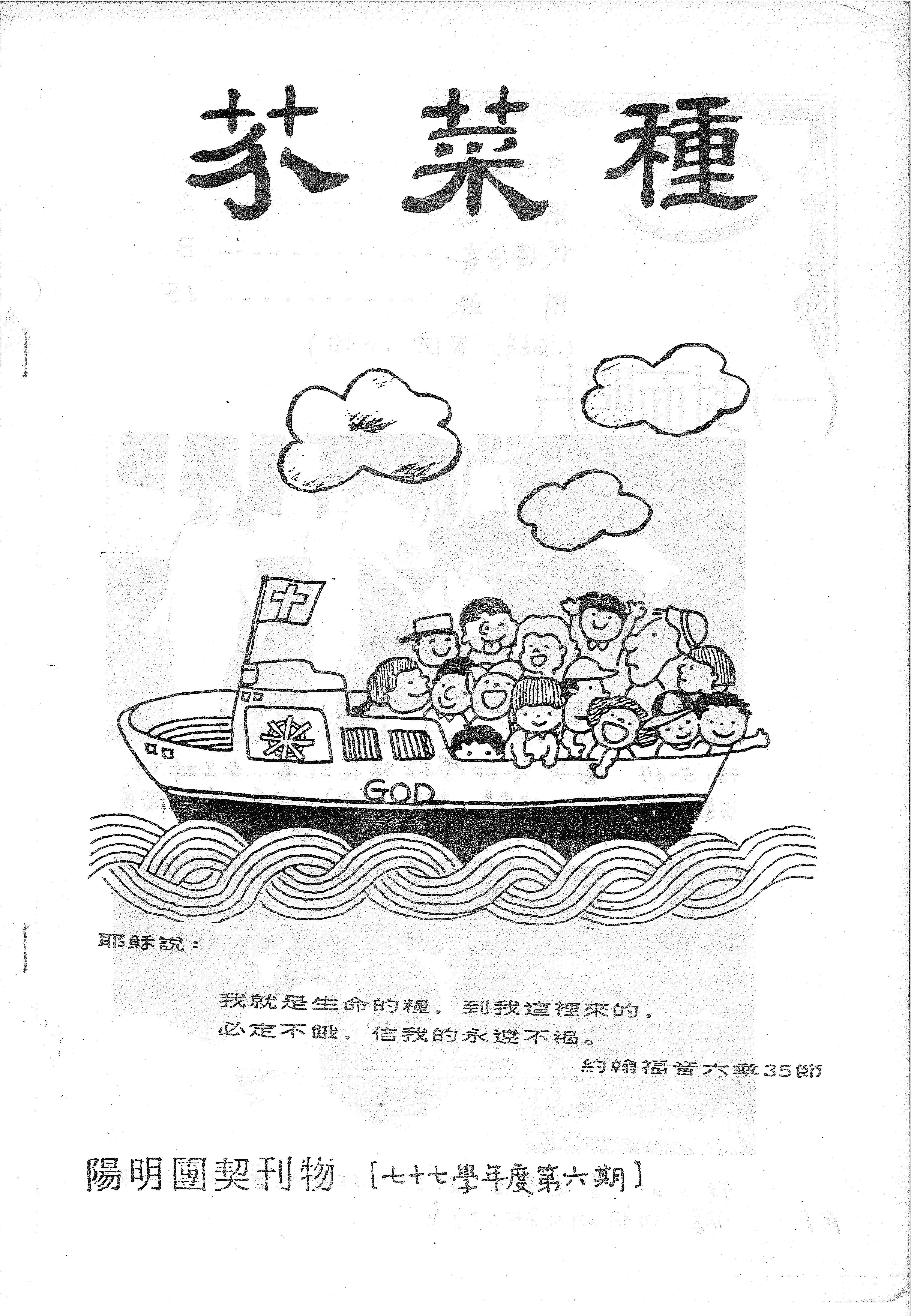 此頁為陽明團契刊物《芥菜種》的封面頁,刊載了約翰福音六章35節的經文:「我就是生命的糧,到我這裡來的,必定不餓,信我的永遠不渴。」頁面包含一幅船隻的插圖,船上載有卡通人物,船頭有十字架旗幟。