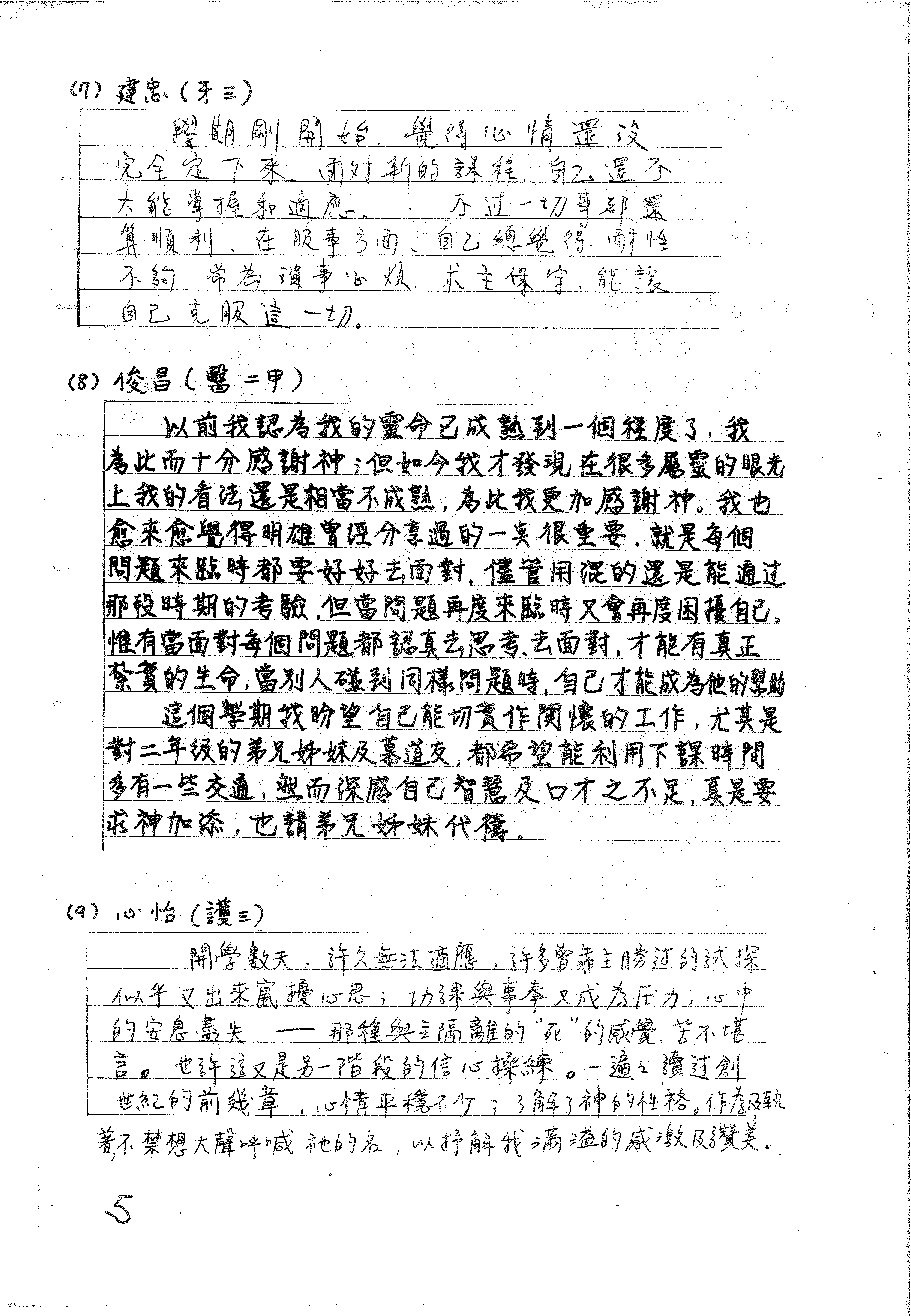 以前我認為我的靈命已成熟到一個程度了,我 為此而十分感謝神;但如今我才發現在很多屬靈的眼光 上我的看法還是相當不成熟,為此我更加感謝神。我也 愈來愈覺得明雄曾經分享過的一點很重要,就是每個 問題來臨時都要好好去面對,儘管用混的還是能通過 那段時期的考驗,但當問題再度來臨時又會再度困擾自己。 惟有當面對每個問題都認真去思考、去面對,才能有真正 紮實的生命,當別人碰到同樣問題時,自己才能成為他的幫助 這個學期我盼望自己能切實作關懷的工作,尤其是 對二年級的弟兄姊妹及慕道友,都希望能利用下課時間 多有一些交通,然而深感自己智慧及口才之不足,真是要 求神加添,也請弟兄姊妹代禱。