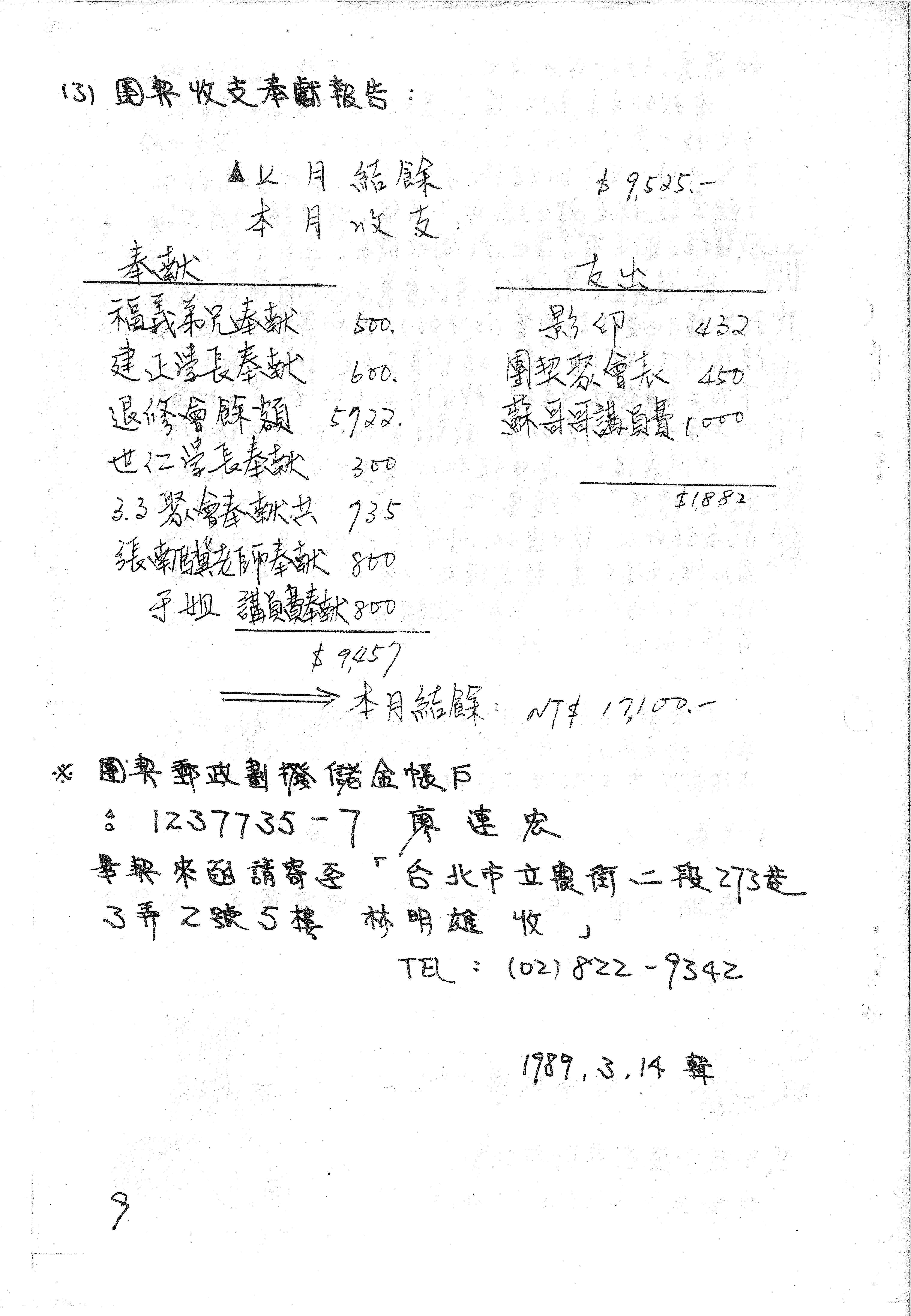 此頁為團契的收支奉獻報告,列出了上月結餘、本月奉獻收入及各項支出,並顯示本月結餘金額。奉獻者包括弟兄、學長、老師和于姐,支出項目有影印、團契聚會表和蘇哥哥的講員費。頁面底部提供了團契郵政劃撥儲金帳戶資訊及聯絡地址。