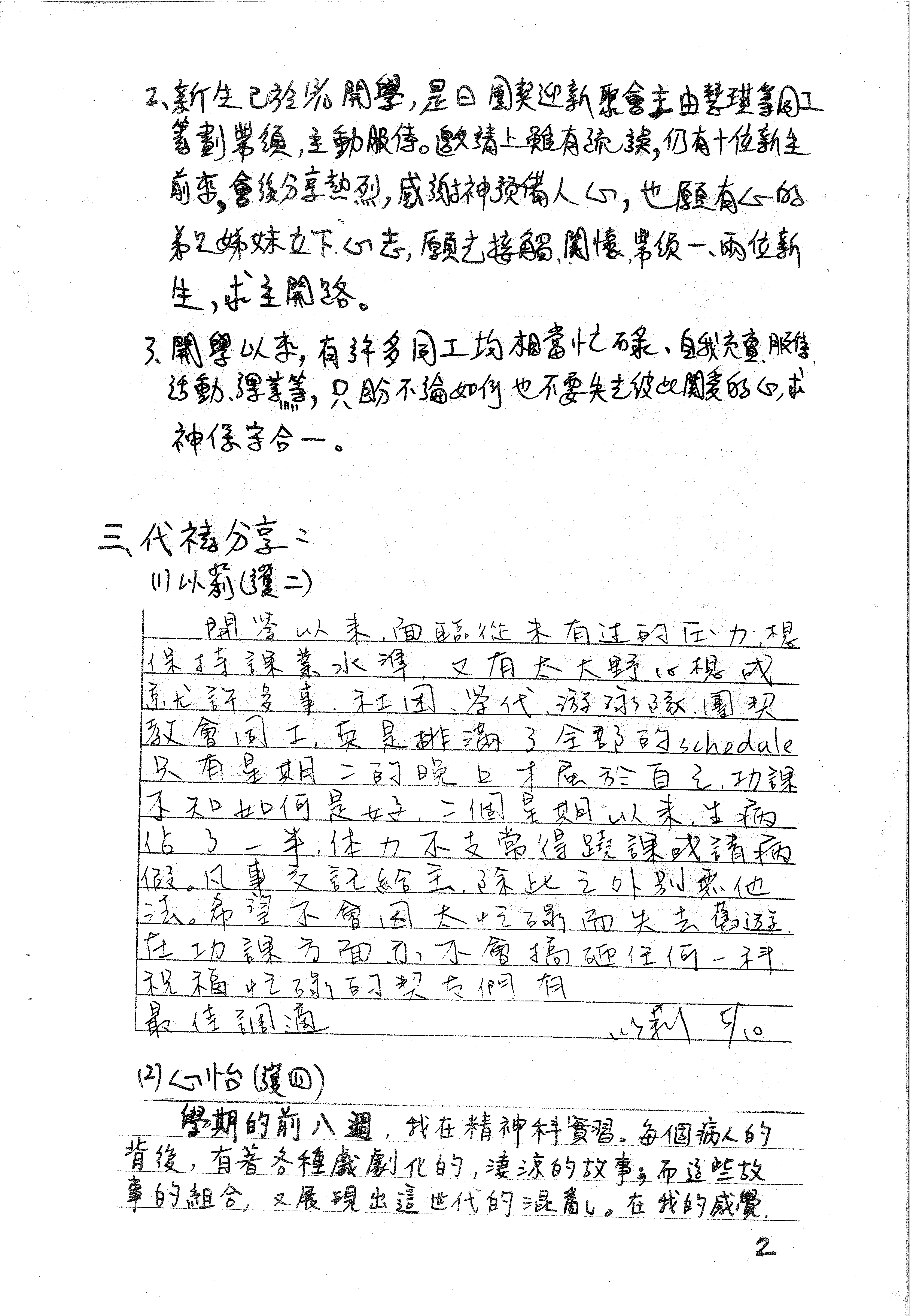開學以來,有許多同工均相當忙碌,自我充實、服侍、活動、課業等,只盼不論如何也不要失去彼此關愛的心,求神保守合一。