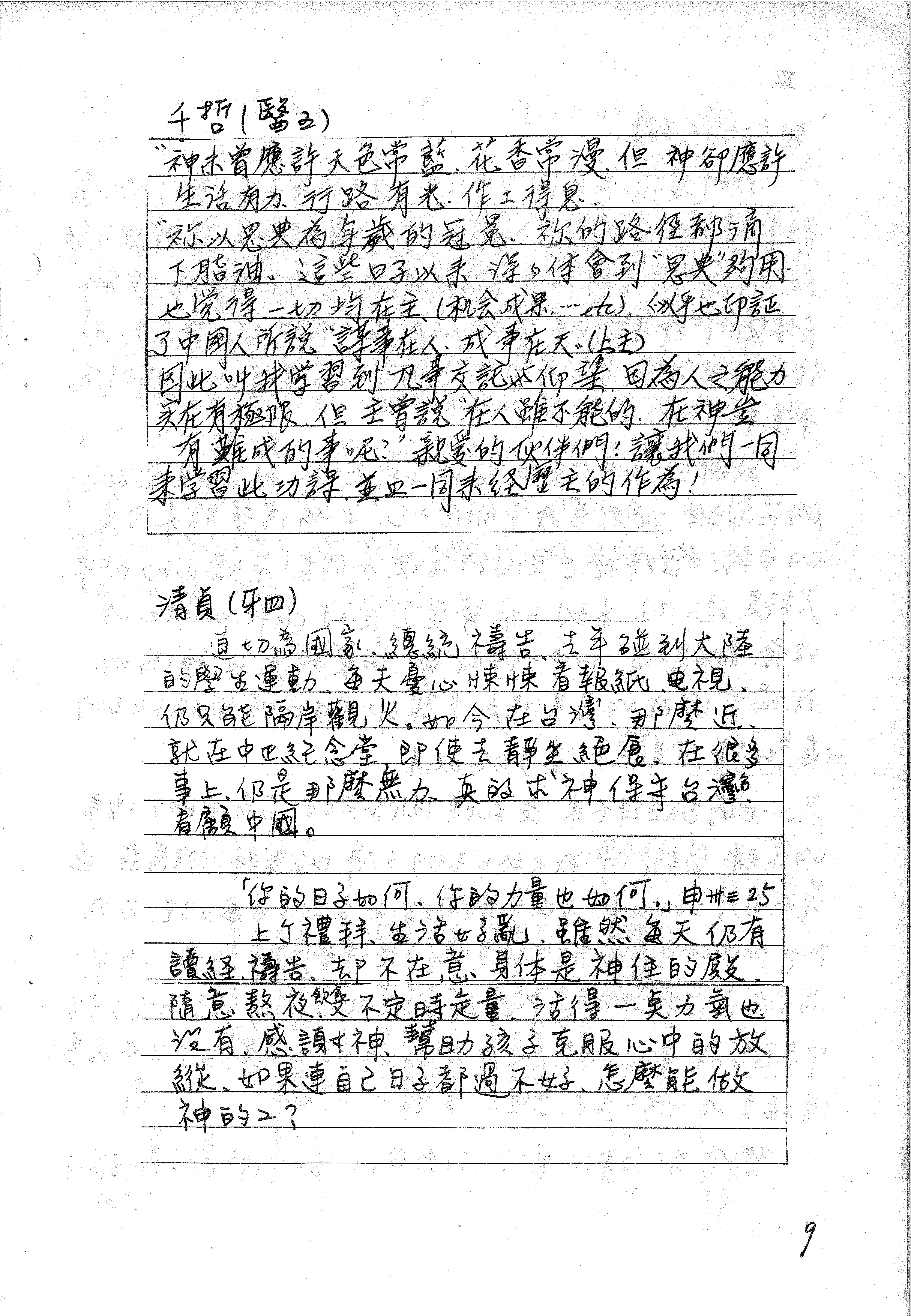 清貞(牙四) 迫切為國家、總統禱告,去年碰到大陸的學生運動,每天憂心忡忡看報紙、电视,仍只能隔岸觀火。如今在台灣,那麼近,就在中正紀念堂,即使去靜坐絕食,在很多事上,仍是那麼無力,真的求神保守台灣並看顧中國。