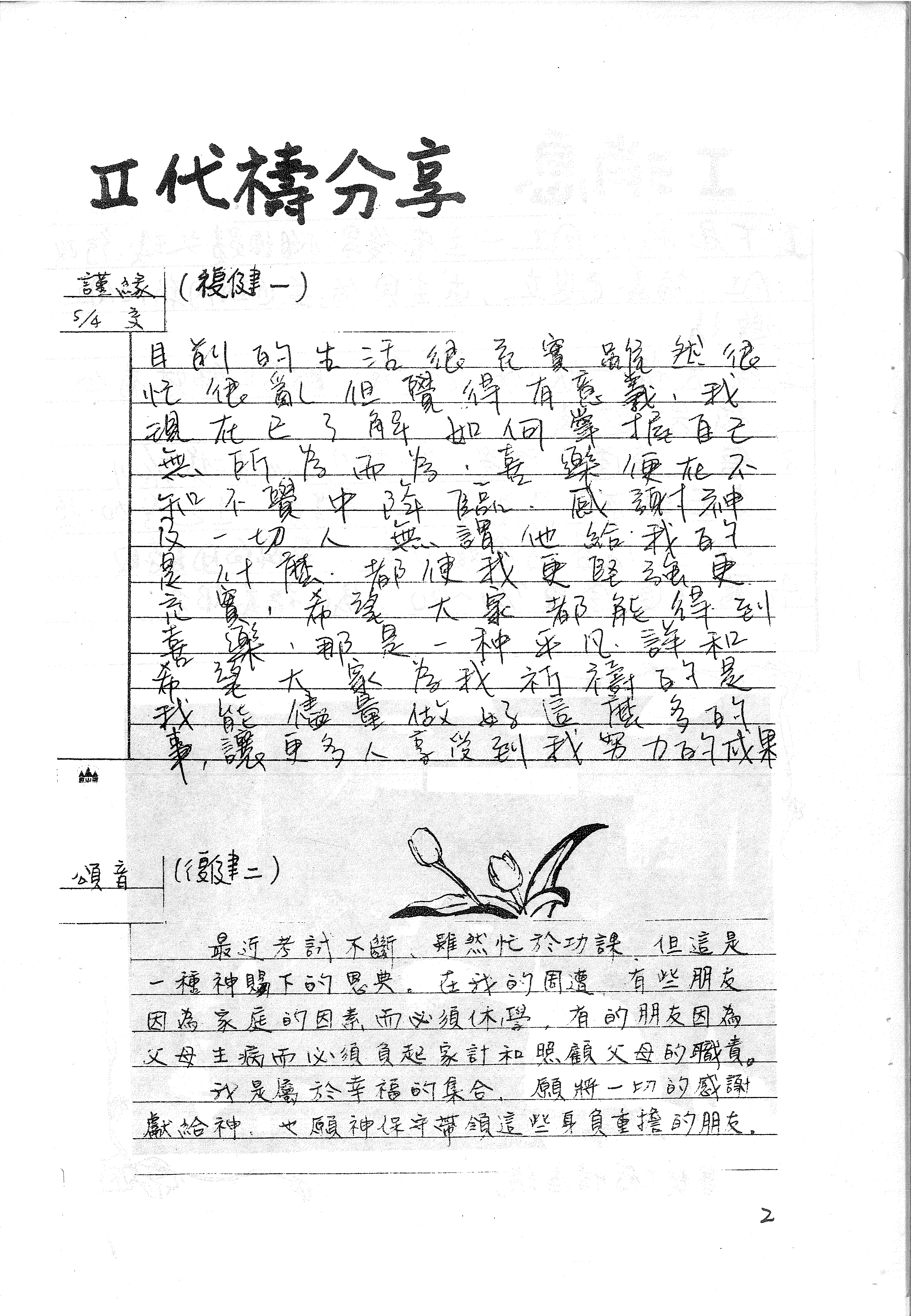 最近考試不斷、雖然忙於功課,但這是一種神賜下的恩典。在我的周遭有些朋友因為家庭的因素而必須休學,有的朋友因為父母生病而必須負起家計和照顧父母的職責。我是屬於幸福的集合,願將一切的感謝獻給神,也願神保守帶領這些身負重擔的朋友。