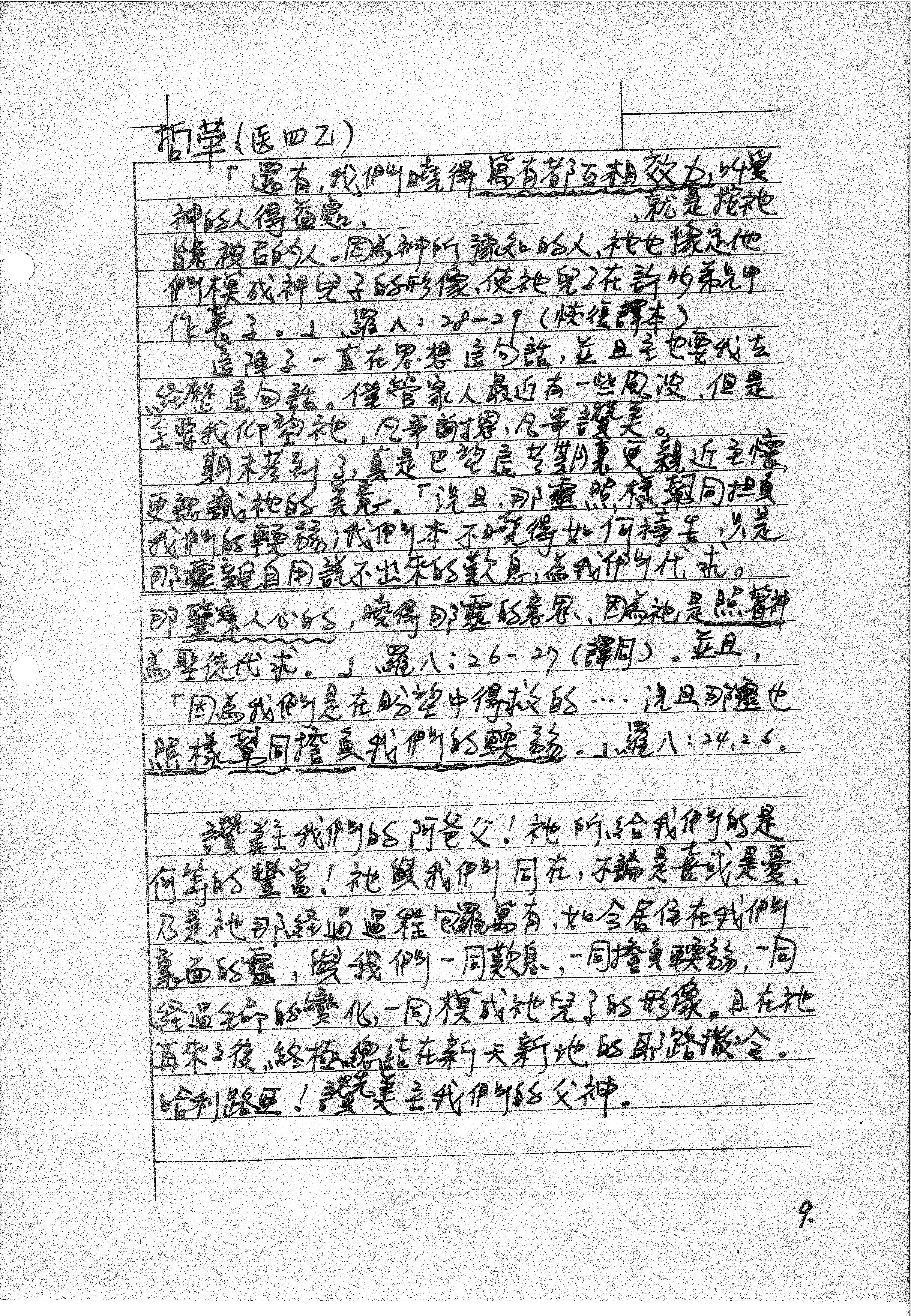 「還有,我們曉得萬事都互相效力,叫愛神的人得益處,就是按祂旨意被召的人。因為神所豫知的人,祂也豫定他們模成神兒子的形像,使祂兒子在許多弟兄中作長子。」羅八:28-29 (恢復譯本)