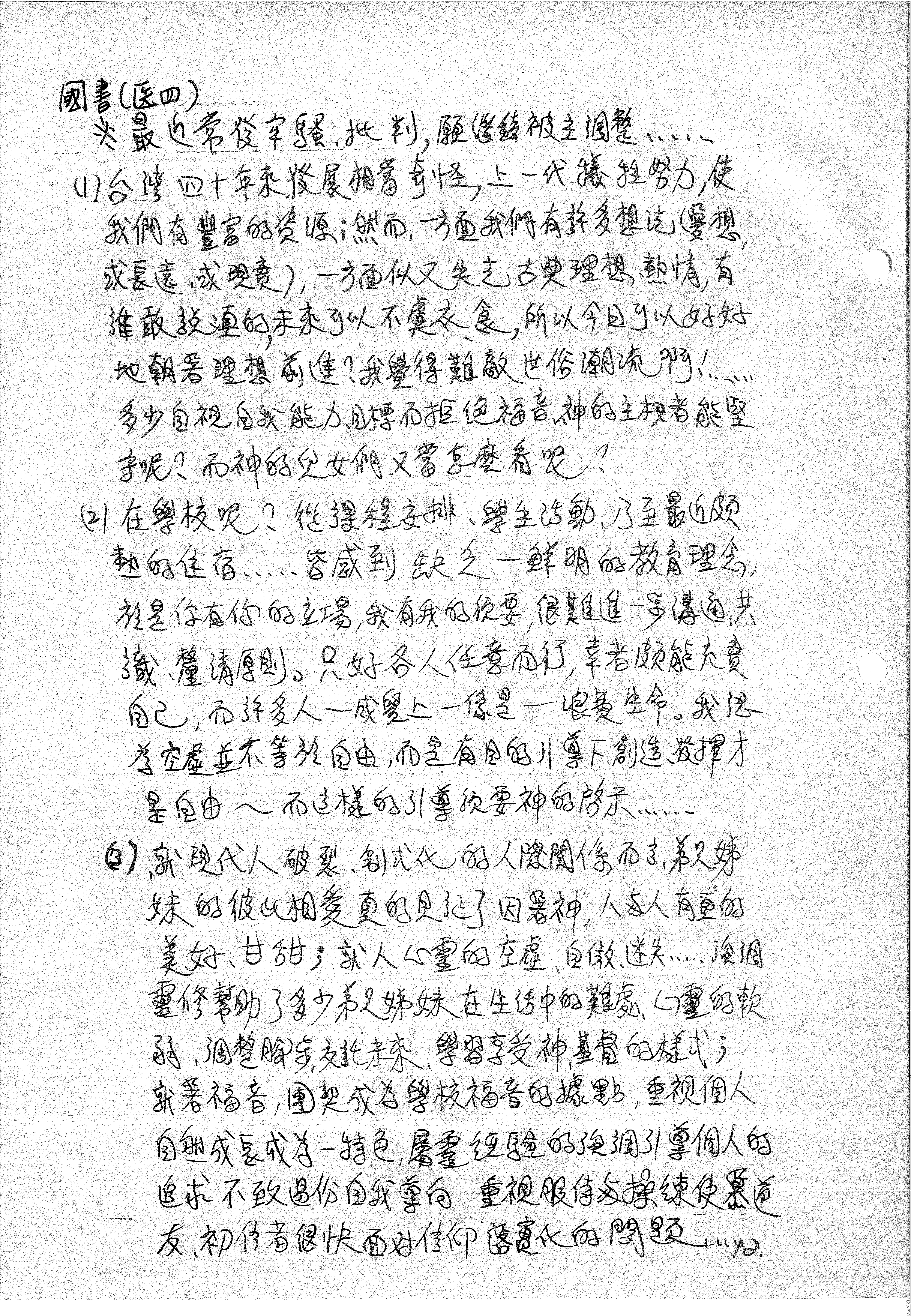 國書(医四) ※最近常發牢騷, 批判, 願繼續被主调整...... (1)台灣四十年來發展相當奇怪, 上一代犧牲努力, 使我們有豐富的资源; 然而, 一方面我們有許多想法(夢想, 或長遠, 或現實), 一方面似又失去古典理想, 熱情, 有誰敢說真的未來可以不虞衣食, 所以今日可以好好地朝著理想前進? 我覺得難敵世俗潮流啊!...... 多少自视自我能力、目標而拒绝福音, 神的主權者能堅守呢? 而神的兒女們又當怎麼看呢? (2)在學校呢? 從課程安排、學生活動, 乃至最近颇熱的住宿.....皆感到缺乏一鲜明的教育理念, 於是你有你的立場, 我有我的须要, 很難進一步溝通, 共識、釐清原則。只好各人任意而行, 幸者颇能充實自己, 而許多人一成變了,像是一場浪費生命。我總覺空虛並不等於自由, 而是有目的引導下創造、發揮才是自由~而這樣的引導须要神的啟示......... (3)就现代人破裂、割裂化的人際關係而言, 弟兄姊妹的彼此相愛真的见证了因著神, 人与人有真的美好、甘甜; 就人心靈的空虛、自傲、迷失.....團契靈修幫助了多少弟兄姊妹在生活中的難處, 心靈的軟弱, 调整腳步, 交託未來, 學習享受神, 基督的樣式; 就著福音, 團契成為學校福音的據點, 重視個人自然成長成為一特色, 屬靈經驗的強調引導個人的追求不致過份自我導向 重視服侍的操練使慕道友、初信者很快面对信仰落實化的問題....