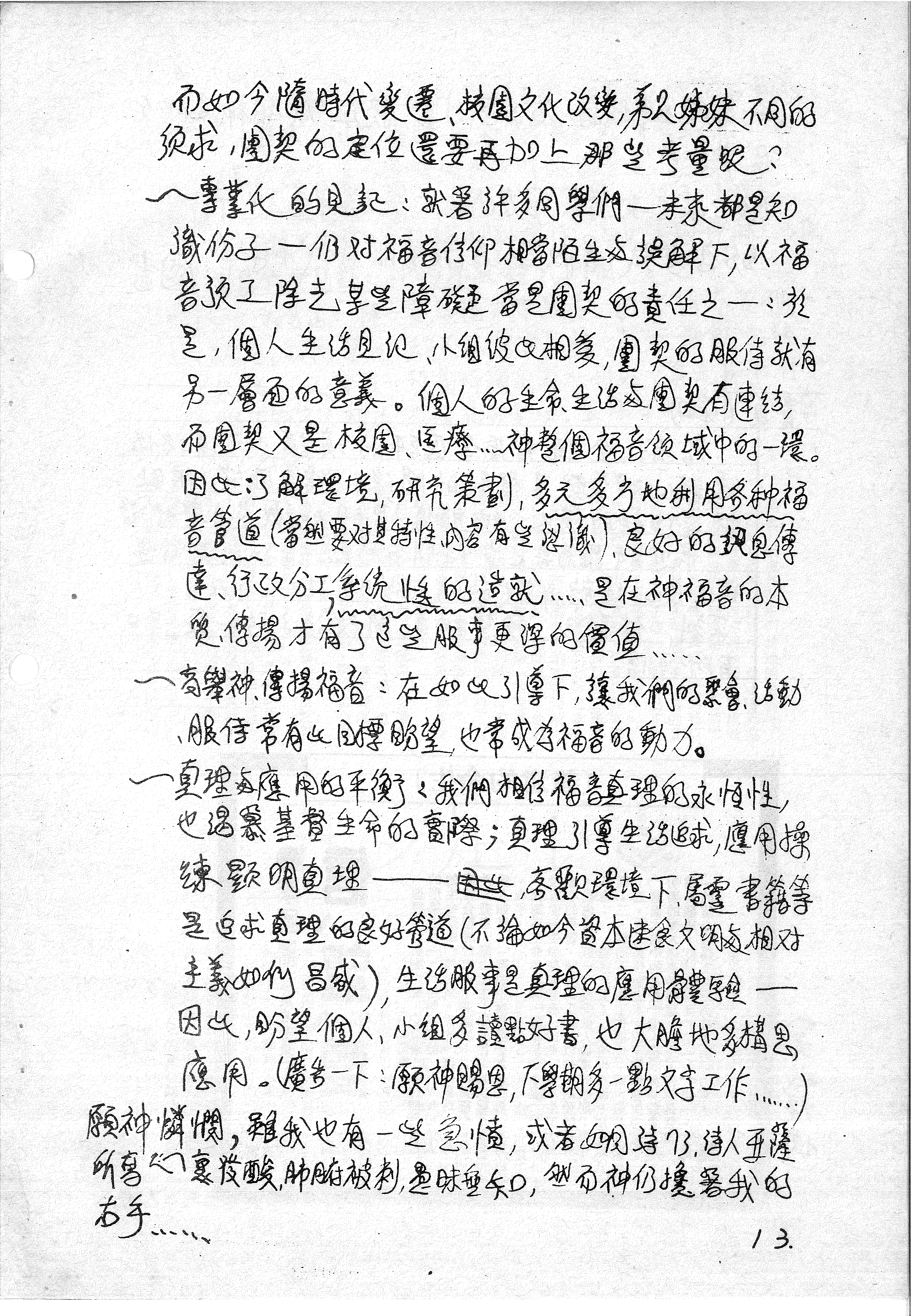 • 專業化的見證:就著許多同學們一未來都是知識份子一仍對福音信仰相當陌生及誤解下,以福音預工除去某些障礙更當是團契的責任之一:於是,個人生活見證、小組彼此相愛,團契的服侍就有另一層面的意義。個人的生命生活與團契有連結,而團契又是校園、医療.....神整個福音領域中的一環。因此了解環境,研究策劃,多元多方地利用各種福音管道(當然要對其特性、內容有些認識),良好的訊息傳達、行政分工系統性的造就......是在神福音的本質傳揚才有了這些服事更深的價值.....