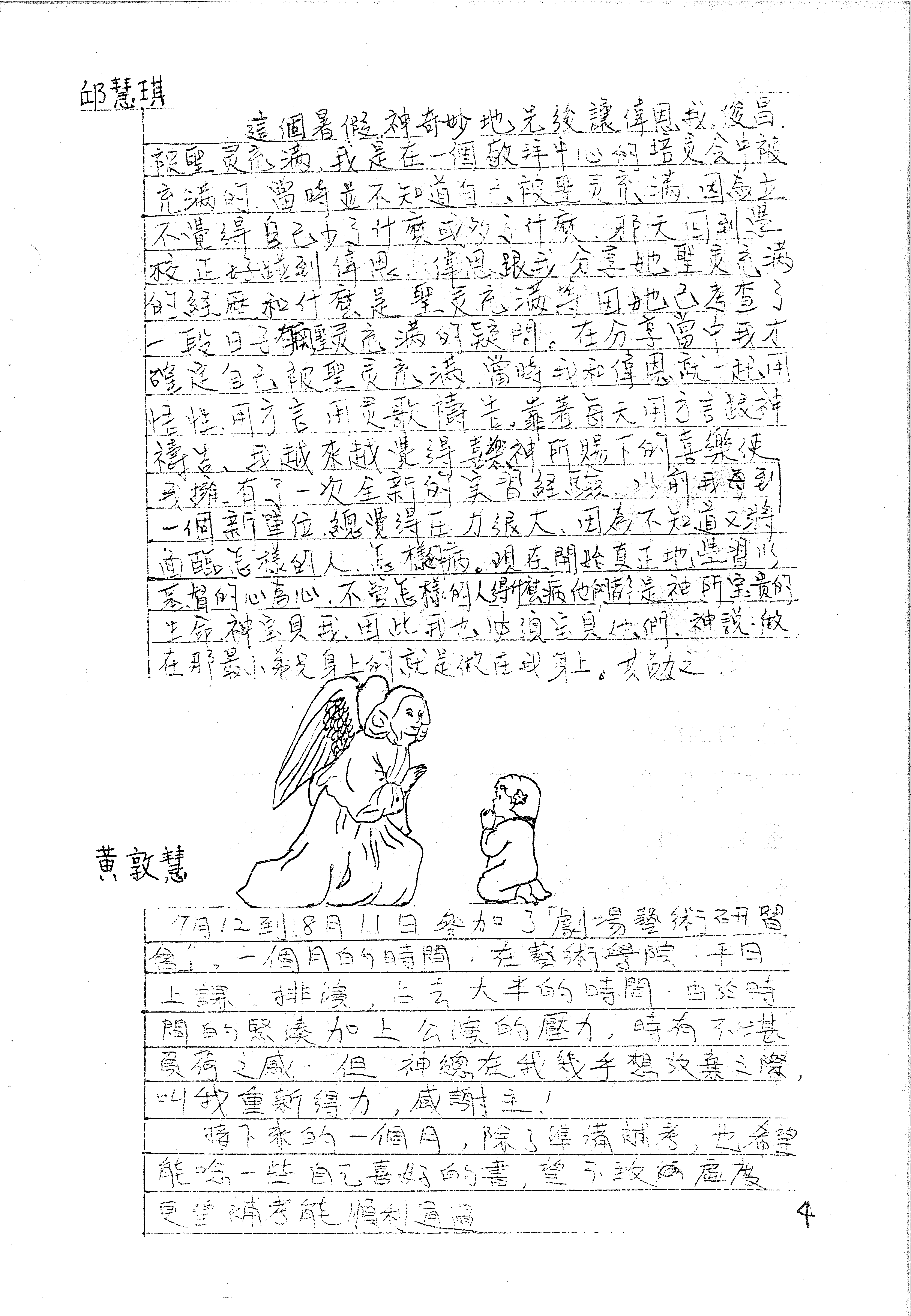 7月12到8月11日參加了「劇場藝術研習營」,一個月的時間,在藝術學院,平日上課、排演,与去大半的時間,由於時間的緊湊加上公演的壓力,時有不堪負荷之感,但神總在我幾乎想放棄之際,叫我重新得力,感謝主!