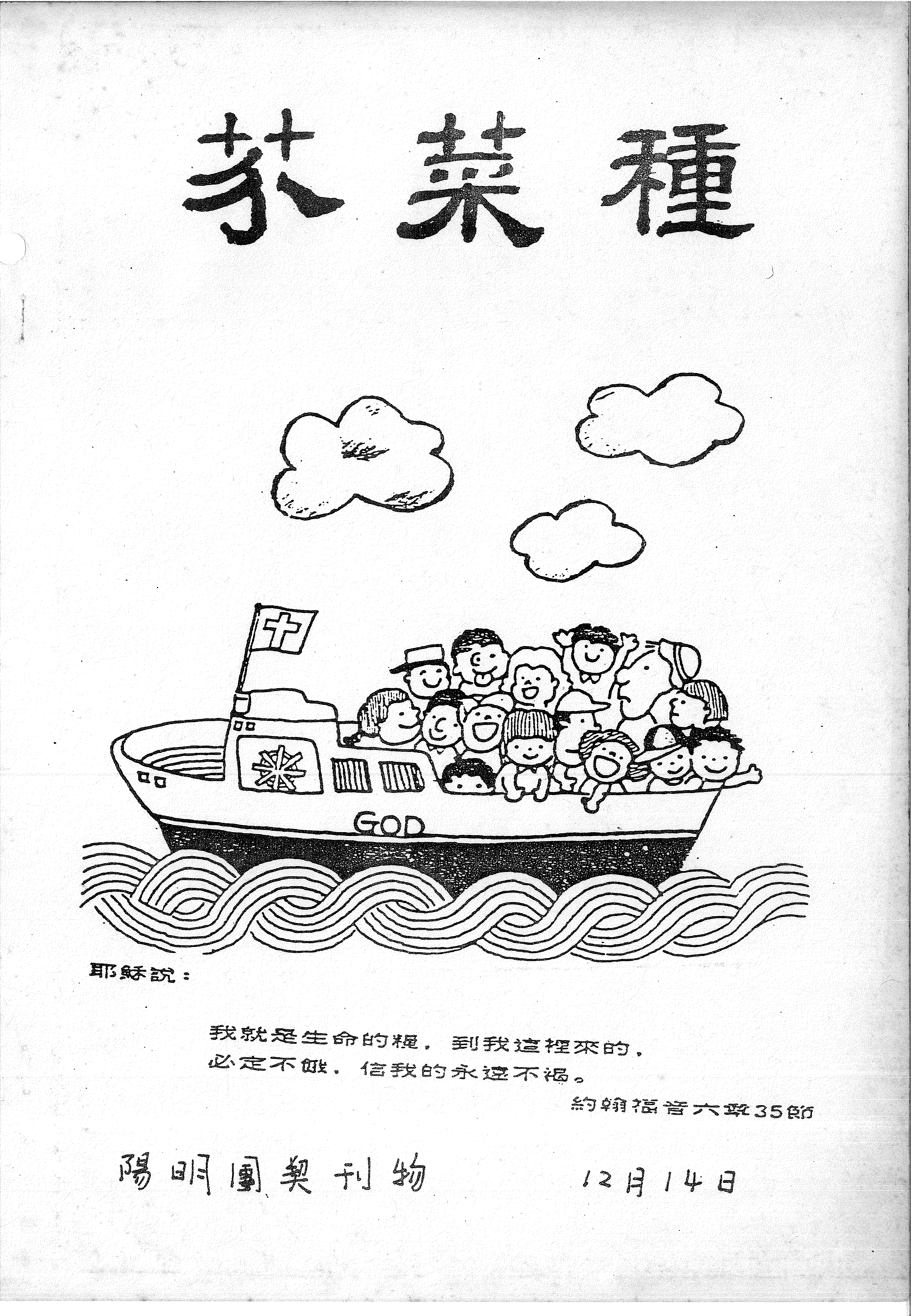 這是一頁陽明團契刊物「芥菜種」,頁面引用了約翰福音六章35節的經文:「我就是生命的糧,到我這裡來的,必定不餓,信我的永遠不渴。」頁面底部標示了刊物日期為12月14日,並描述了一幅船載著快樂的人在海上航行的圖畫。
