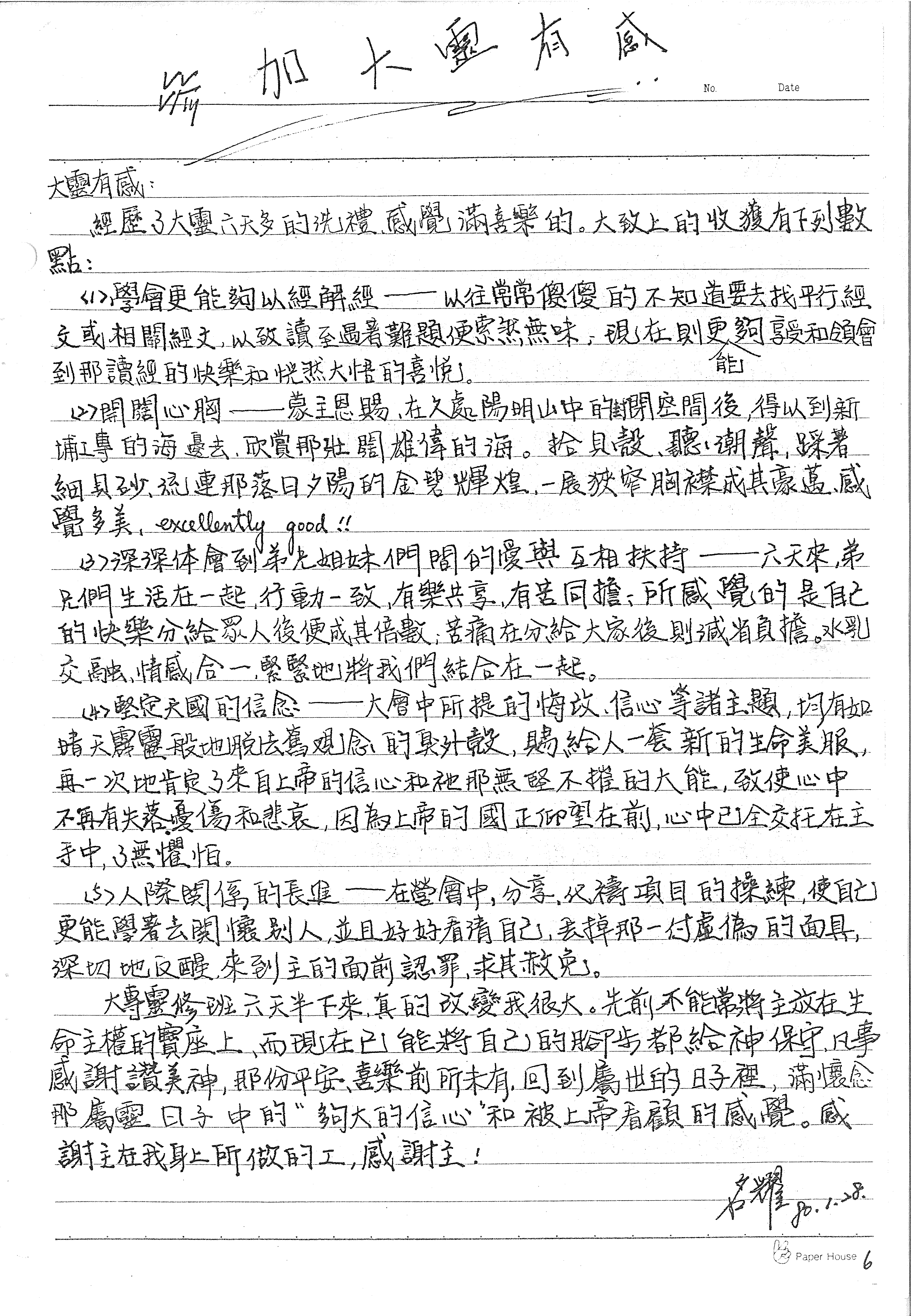 大專靈修班六天半下來,真的改變我很大。先前不能常將主放在生命主權的寶座上,而現在已能將自己的腳步都給神保守,凡事感謝讚美神,那份平安、喜樂前所未有,回到屬世的日子裡,滿懷念那屬靈日子中的“夠大的信心”和被上帝看顧的感覺。感謝主在我身上所做的工,感謝主!