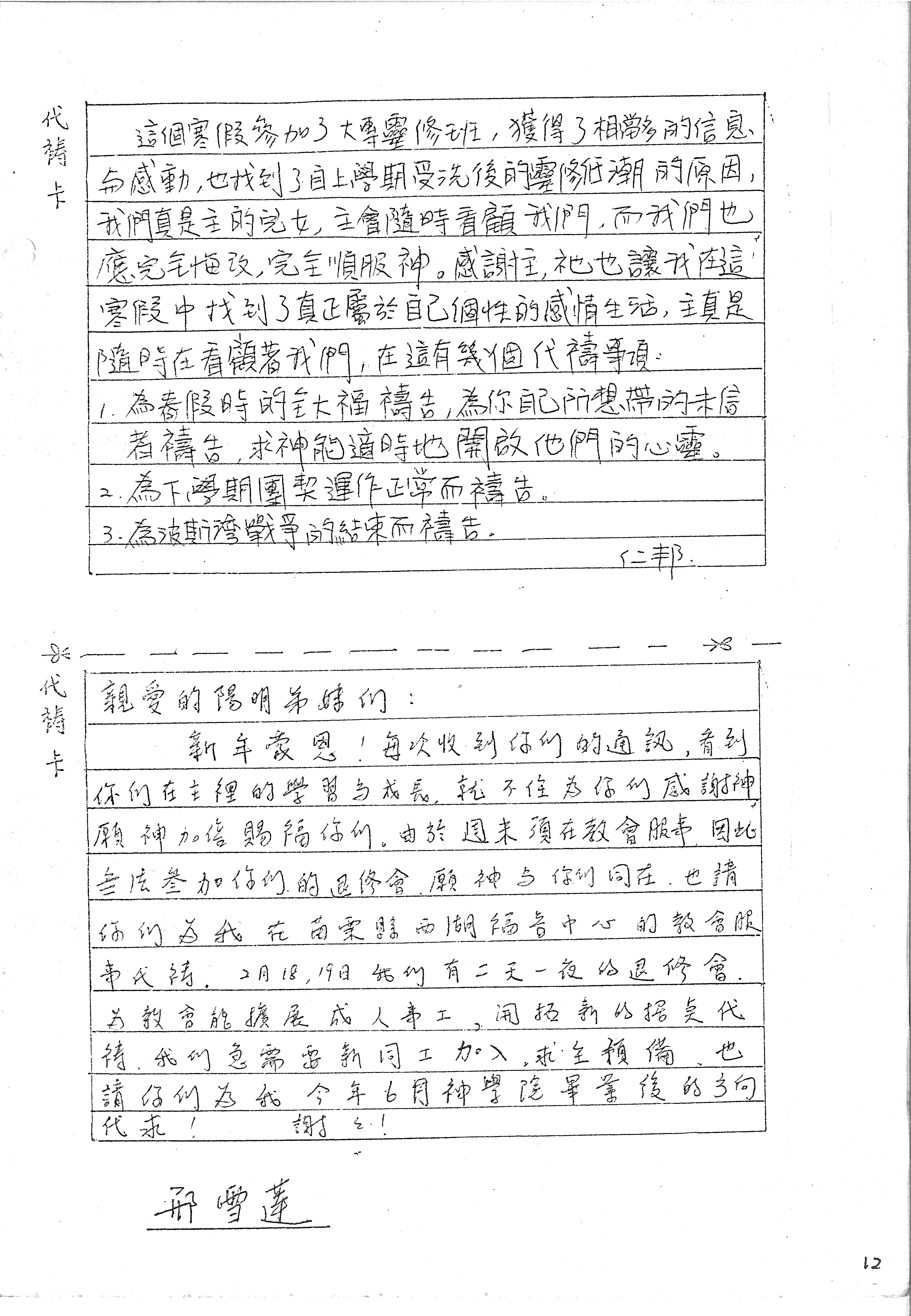親愛的陽明弟妹们: 新年蒙恩!每次收到你们的通訊,看到 你们在主裡的學習与成長,就不住為你的感謝神, 願神加倍賜福你们。由於週末須在教會服事,因此 無法参加你们的退修會,願神与你们同在。也請 你们为我在苗栗縣西湖福音中心的教會服 事代禱。2月18,19日我们有二天一夜的退修會。 为教會能擴展成人事工,開拓新的招募,代禱 我們急需要新同工加入,求主預備。也 請你们為我今年6月神學院畢業後的方向 代求! 謝謝!