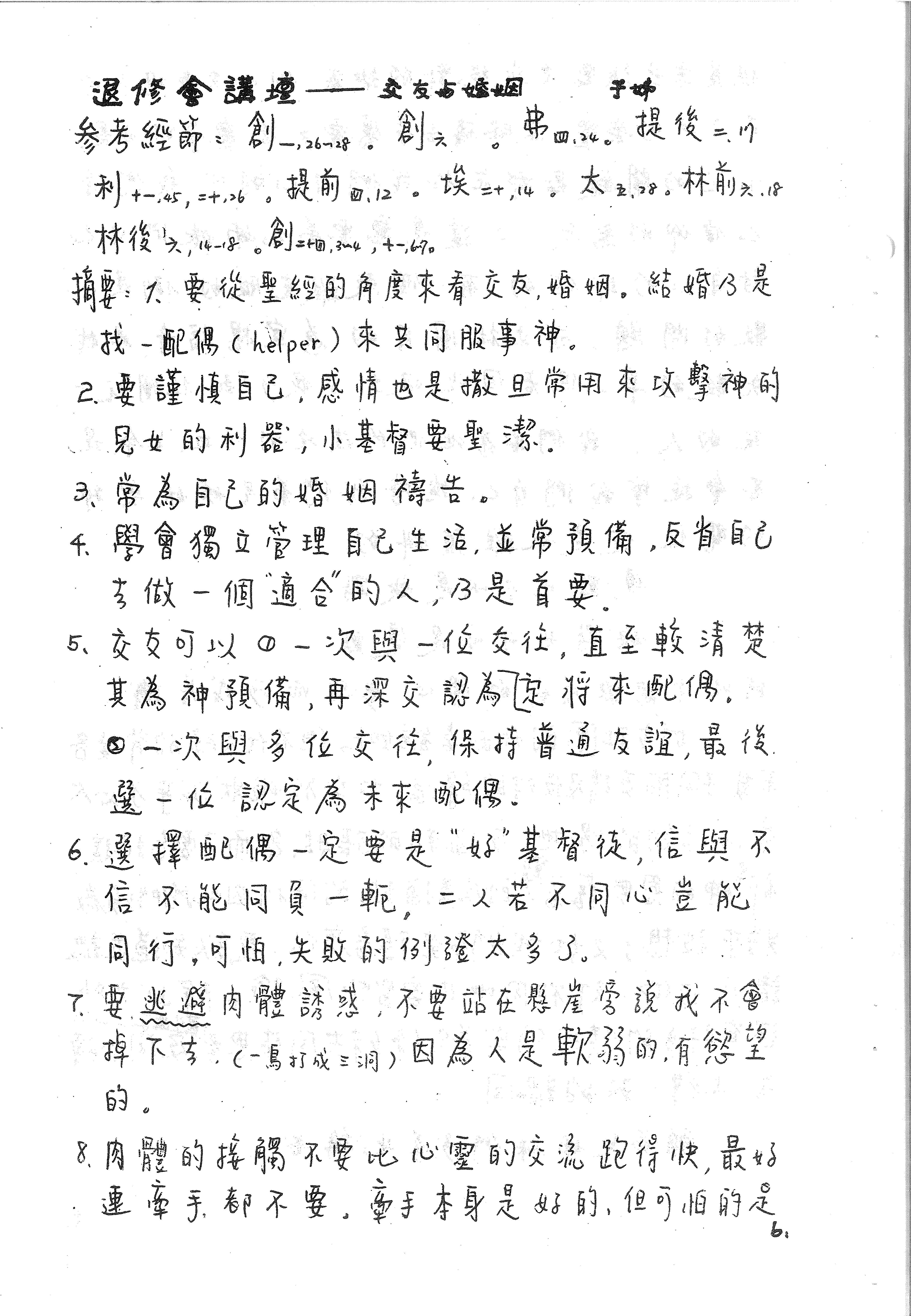 退修會講壇—交友与婚姻 手姊 參考經節:創一,26-28。創元。弗四:24。提後三:17 利十一,45, 二十,26。提前四、12。埃二十,14。太五、28。林前六.18 林後六,14-18。創二四, 3-4, 十, 67。 摘要:1. 要從聖經的角度來看交友, 婚姻。結婚乃是 找一配偶(helper)來共同服事神。 2. 要謹慎自己, 感情也是撒旦常用來攻擊神的 兒女的利器, 小基督要聖潔。 3. 常為自己的婚姻禱告。 4. 學會獨立管理自己生活, 並常預備, 反省自己 去做一個“適合”的人, 乃是首要。 5. 交友可以 ① 一次與一位交往, 直至較清楚 其為神預備, 再深交認為[?]定將來配偶。 ② 一次與多位交往, 保持普通友誼, 最後 選一位認定為未來配偶。 6. 選擇配偶一定要是“好”基督徒, 信與不 信不能同負一軛, 二人若不同心豈能 同行, 可怕, 失敗的例證太多了。 7. 要逃避肉體誘惑, 不要站在懸崖旁說我不會 掉下去, (一失足成千古恨) 因為人是軟弱的, 有慾望 的。 8. 肉體的接觸不要比心靈的交流跑得快, 最好 連牽手都不要。牽手本身是好的, 但可怕的是 [?]。