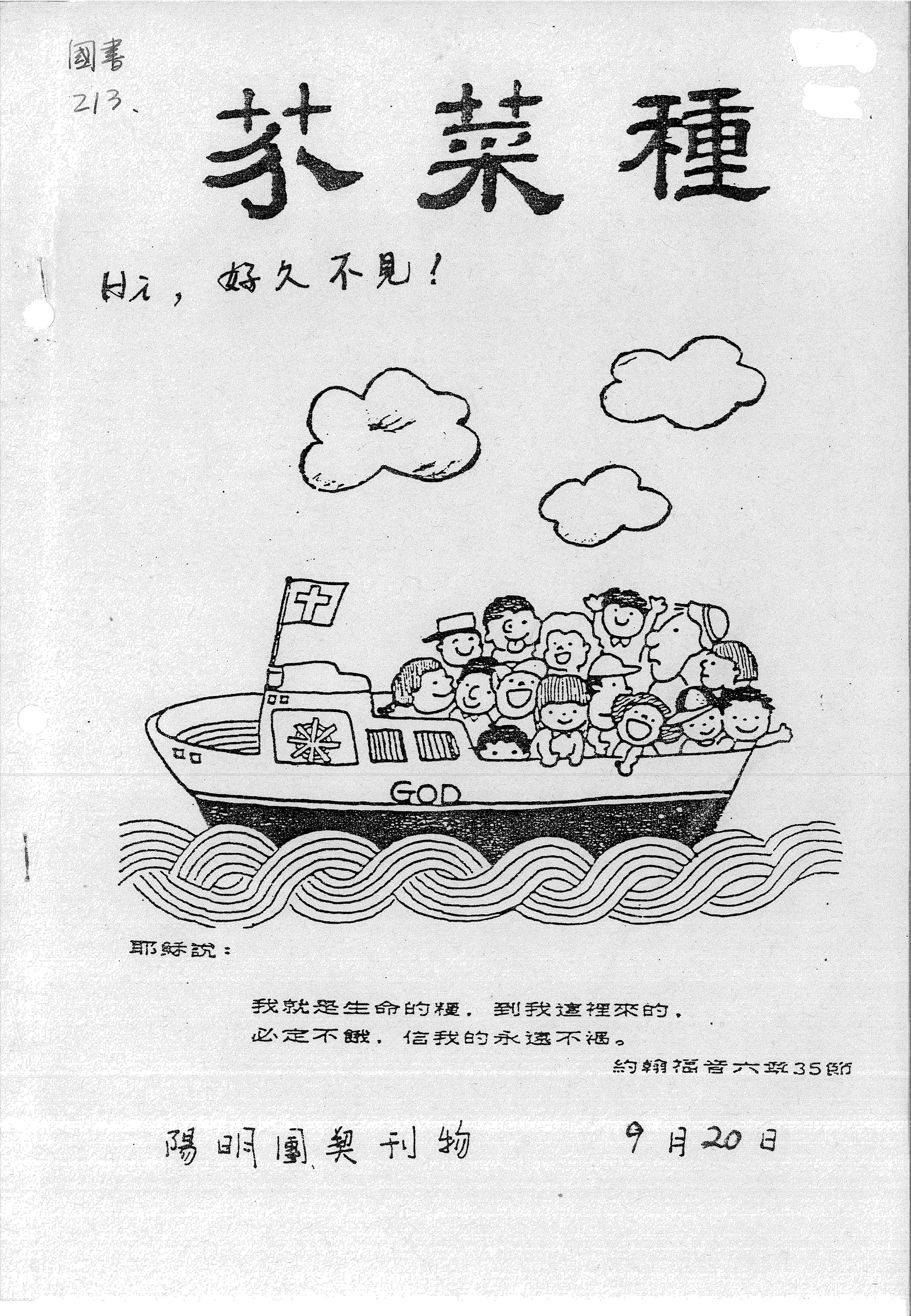 這是一份陽明團契的刊物「芥菜種」,內容包含耶穌所說「我就是生命的糧」的經文,並配有一張船隻在海上航行的插圖。
