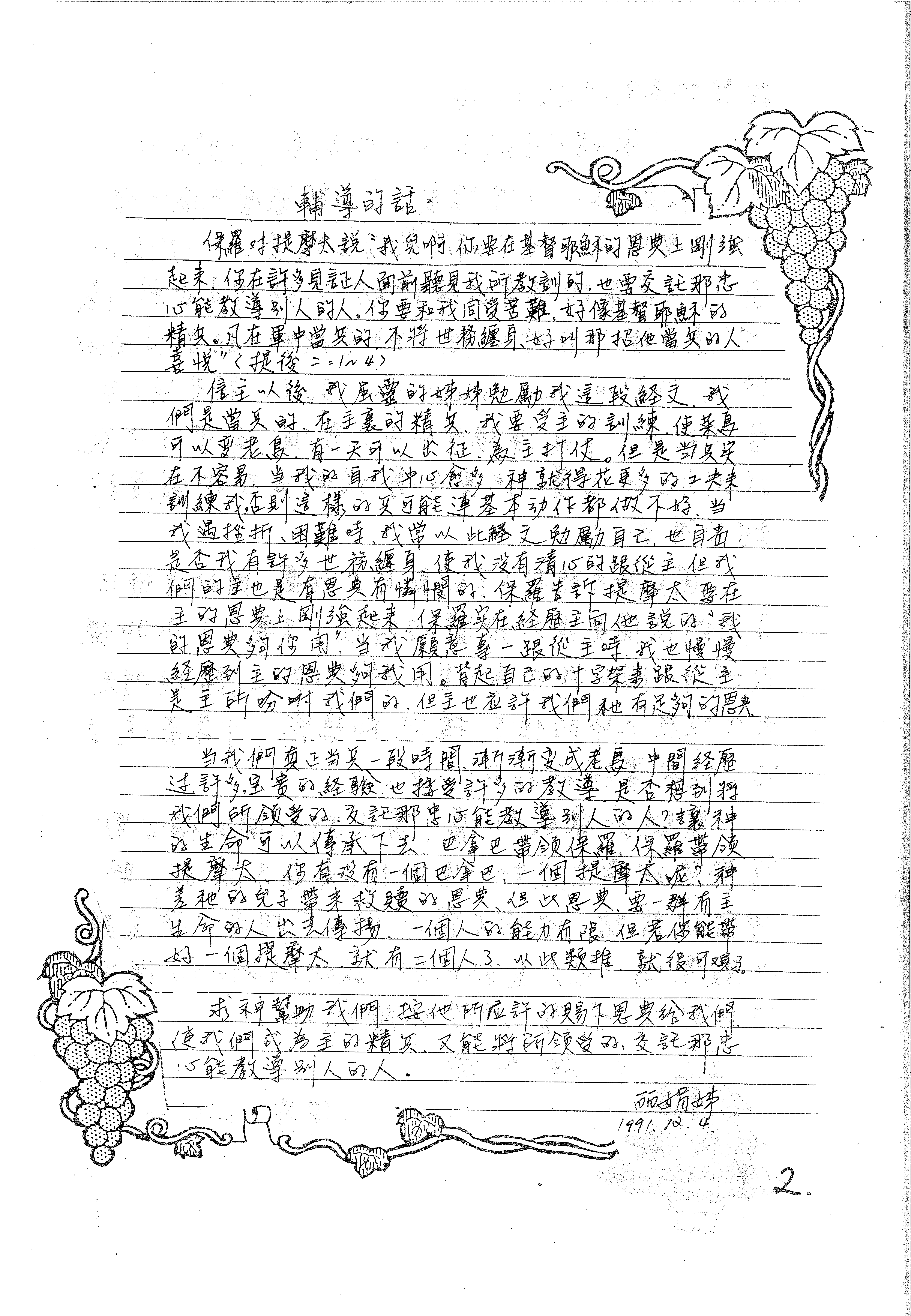 當我們真正當兵一段時間,漸漸變成老鳥,中間經歷過許多寶貴的經驗,也接受許多的教導,是否想到將我們所領受的,交託那忠心能教導別人的人?讓神的生命可以傳承下去。巴拿巴帶領保羅,保羅帶領提摩太,你有沒有一個巴拿巴,一個提摩太呢?神差祂的兒子帶來救贖的恩典,但此恩典,要一群有主生命的人出去傳揚。一個人的能力有限,但若你能帶好一個提摩太,就有二個人了,以此類推,就很可觀了。