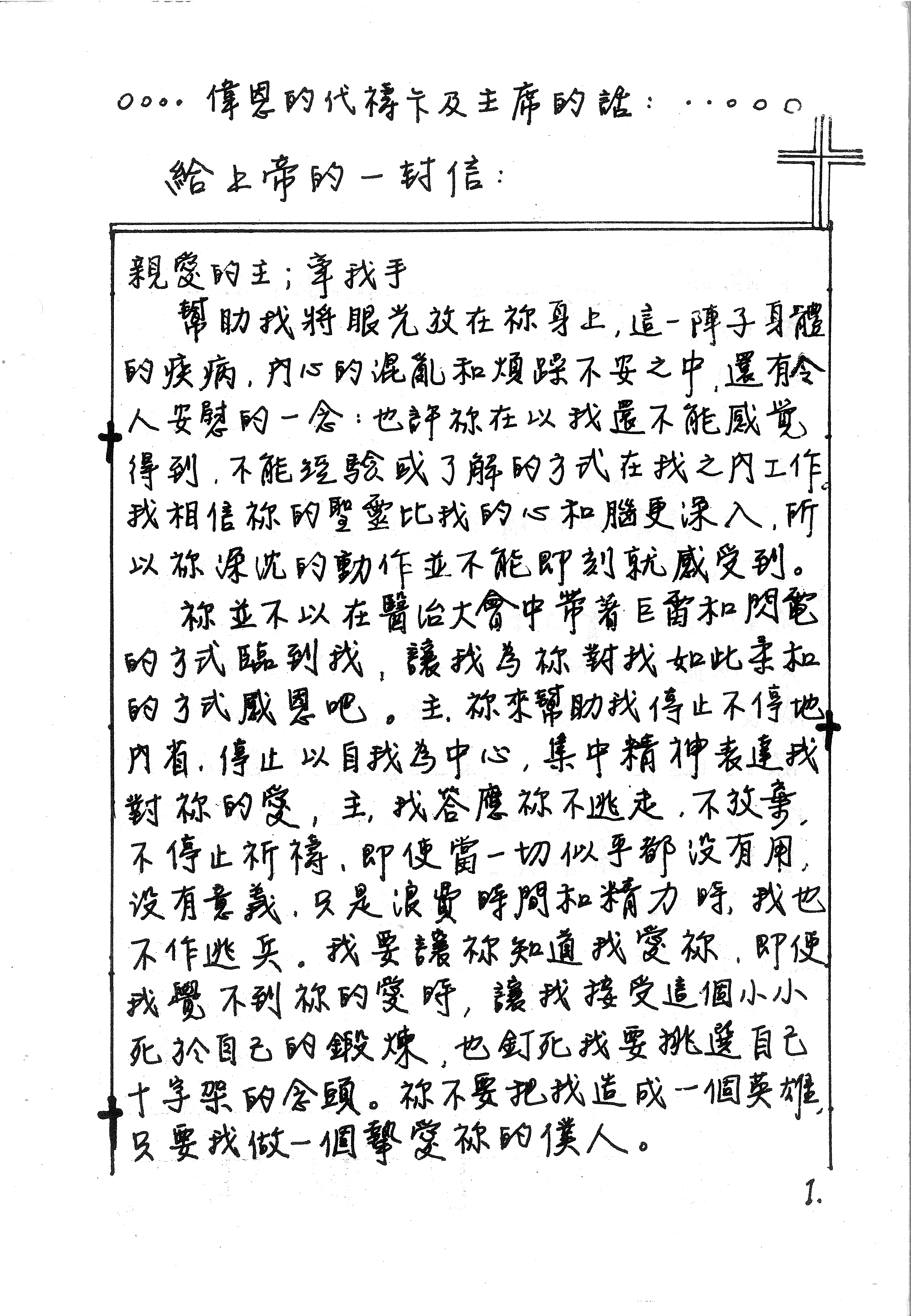 此頁為偉恩的代禱卡,內容是寫給上帝的一封信,亦為主席的話。信中表達了在身體疾病、內心混亂和煩躁不安中對上帝的信靠,並承諾不逃避、不放棄祈禱,即使在困難中也願做摯愛上帝的僕人。