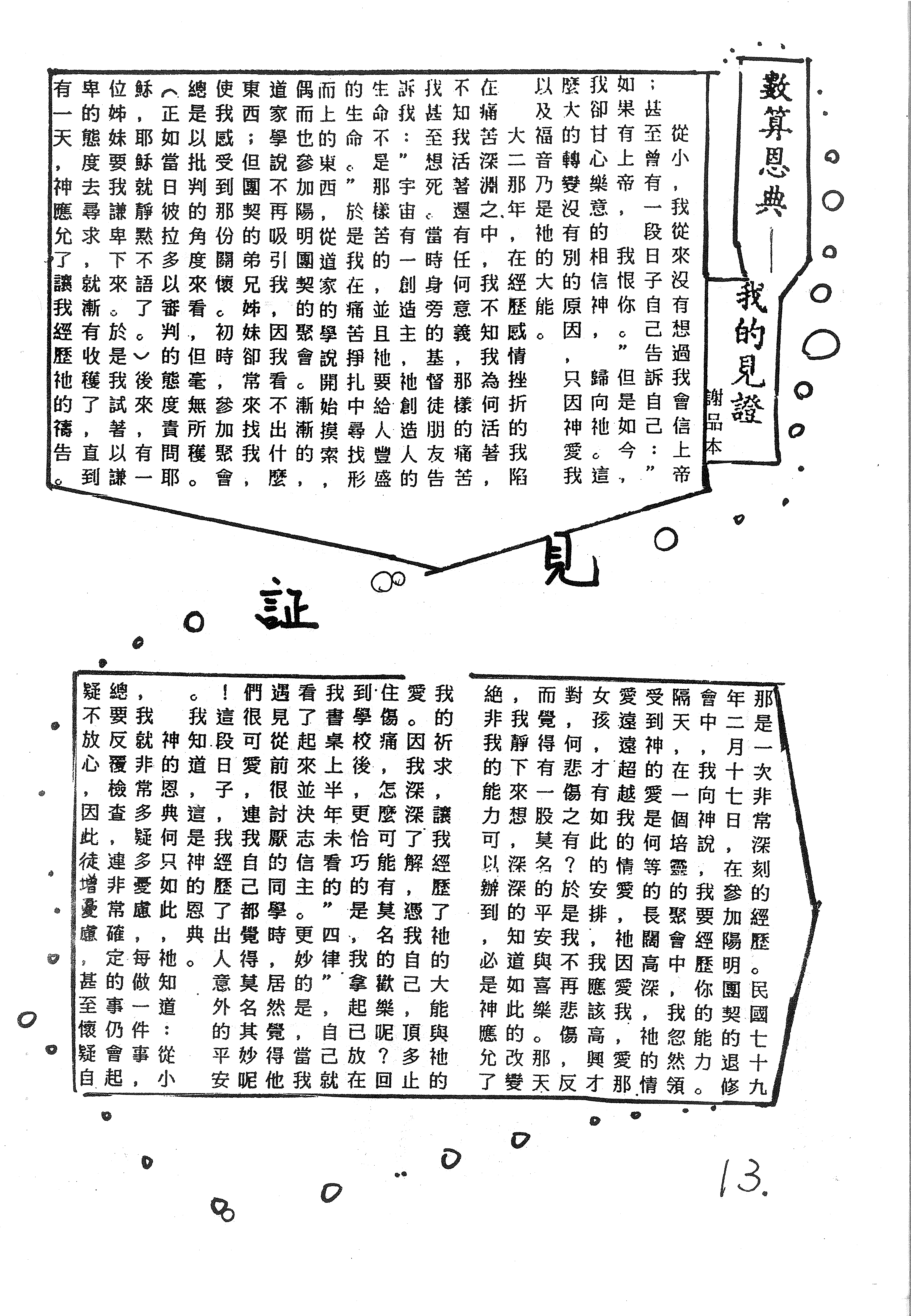 此頁為謝品本的個人見證,講述他從懷疑與痛苦中,透過謙卑尋求神、經歷試煉,並在團契弟兄姊妹的幫助下,從道家思想轉向相信神的愛,最終甘心樂意歸向神的心路歷程。
