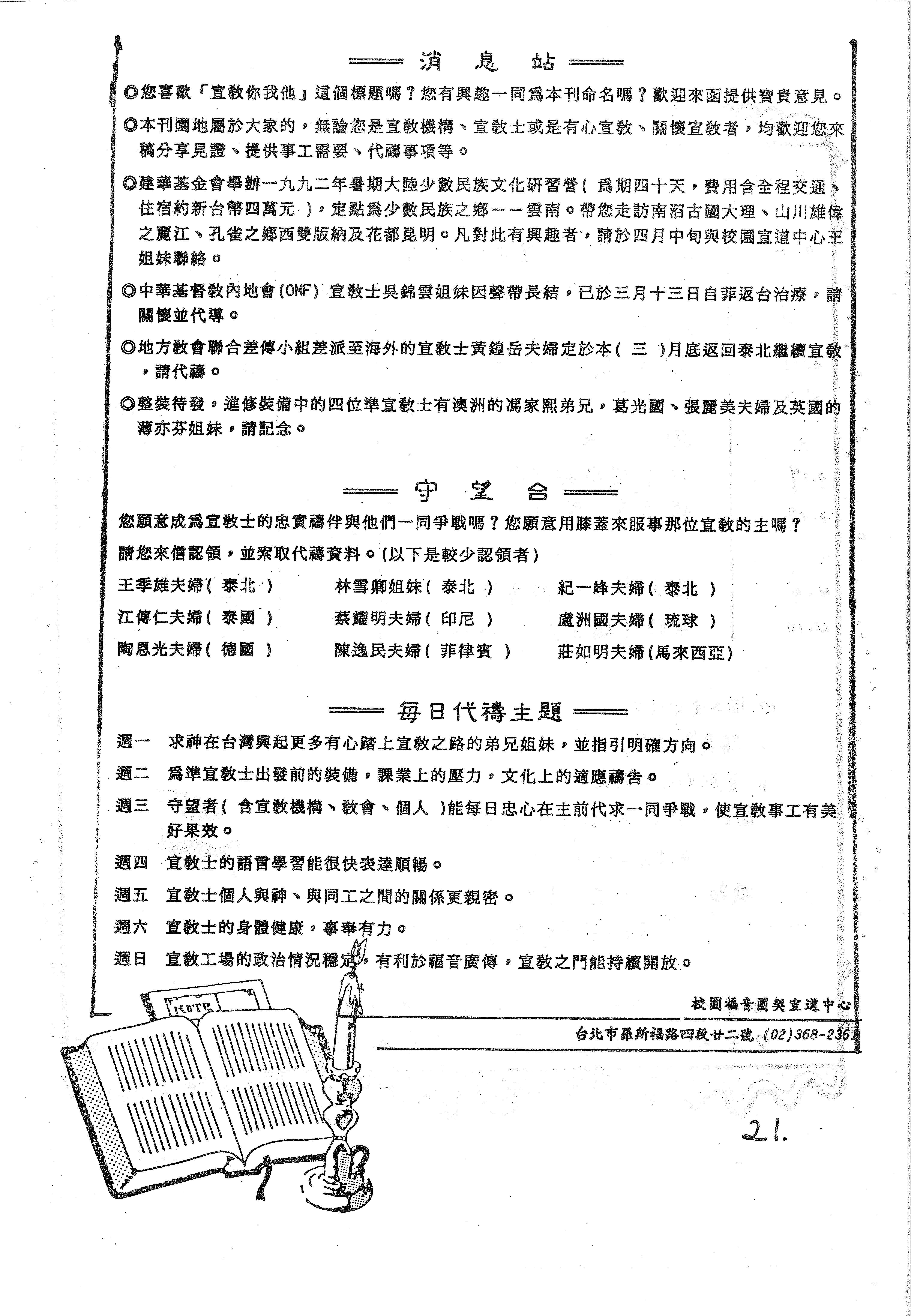 本頁包含「消息站」和「守望台」兩部分。「消息站」刊登了關於「宣教你我他」標題徵集、稿件徵集、1992年暑期大陸少數民族文化研習營的資訊,以及宣教士吳錦雲姐妹返台治療和黃鎮岳夫婦返回泰北宣教的代禱消息,並提及四位準宣教士的裝備情況。「守望台」則呼籲讀者認領宣教士作為禱伴,並列出多位宣教士夫婦的姓名及宣教地點,最後提供每日代禱主題。