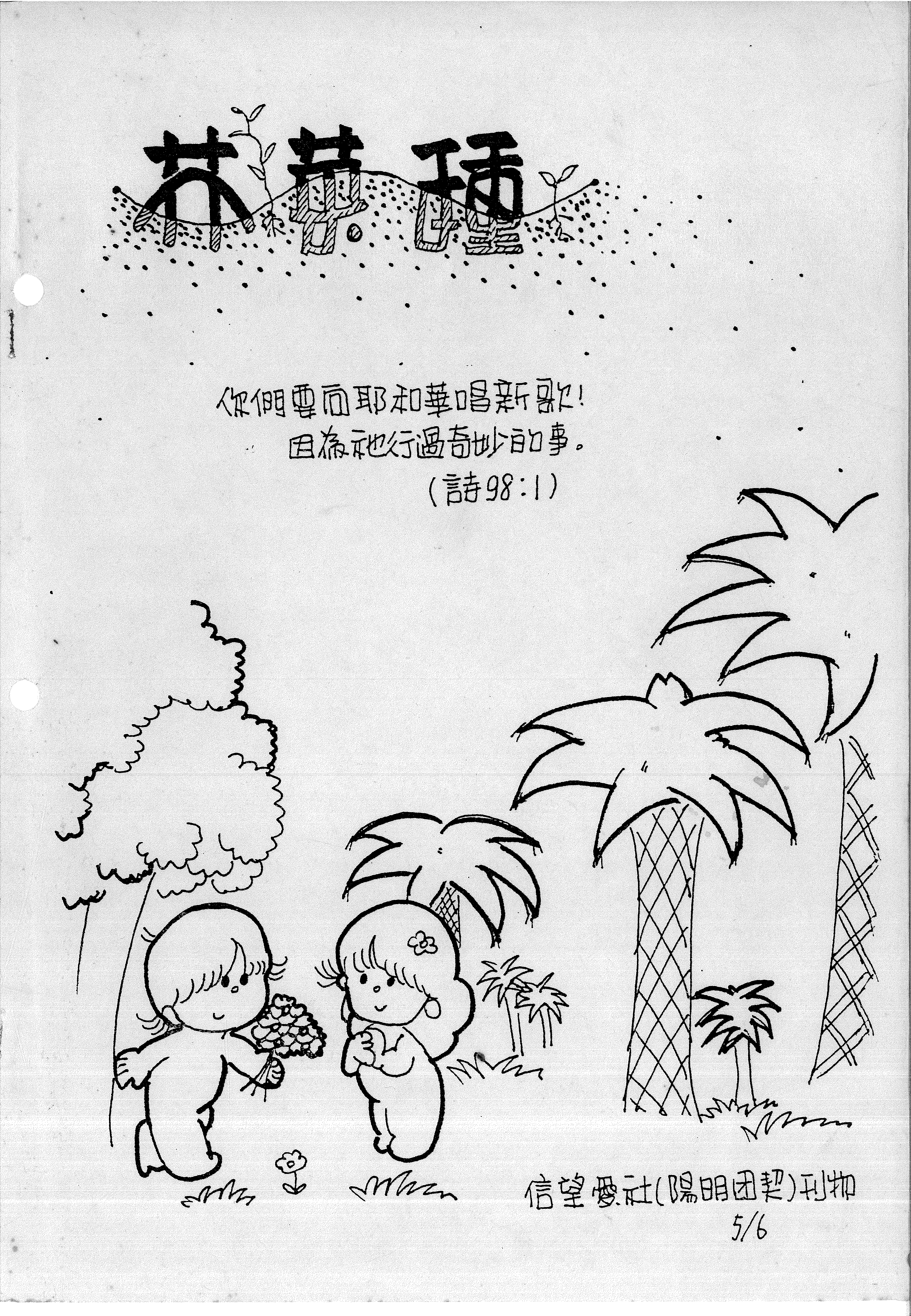 此頁為陽明信望愛團契刊物的一部分,標題為「林恭頌」,並引用了詩篇98篇1節的經文。頁面包含一幅卡通插畫,描繪一個小男孩送花給小女孩。