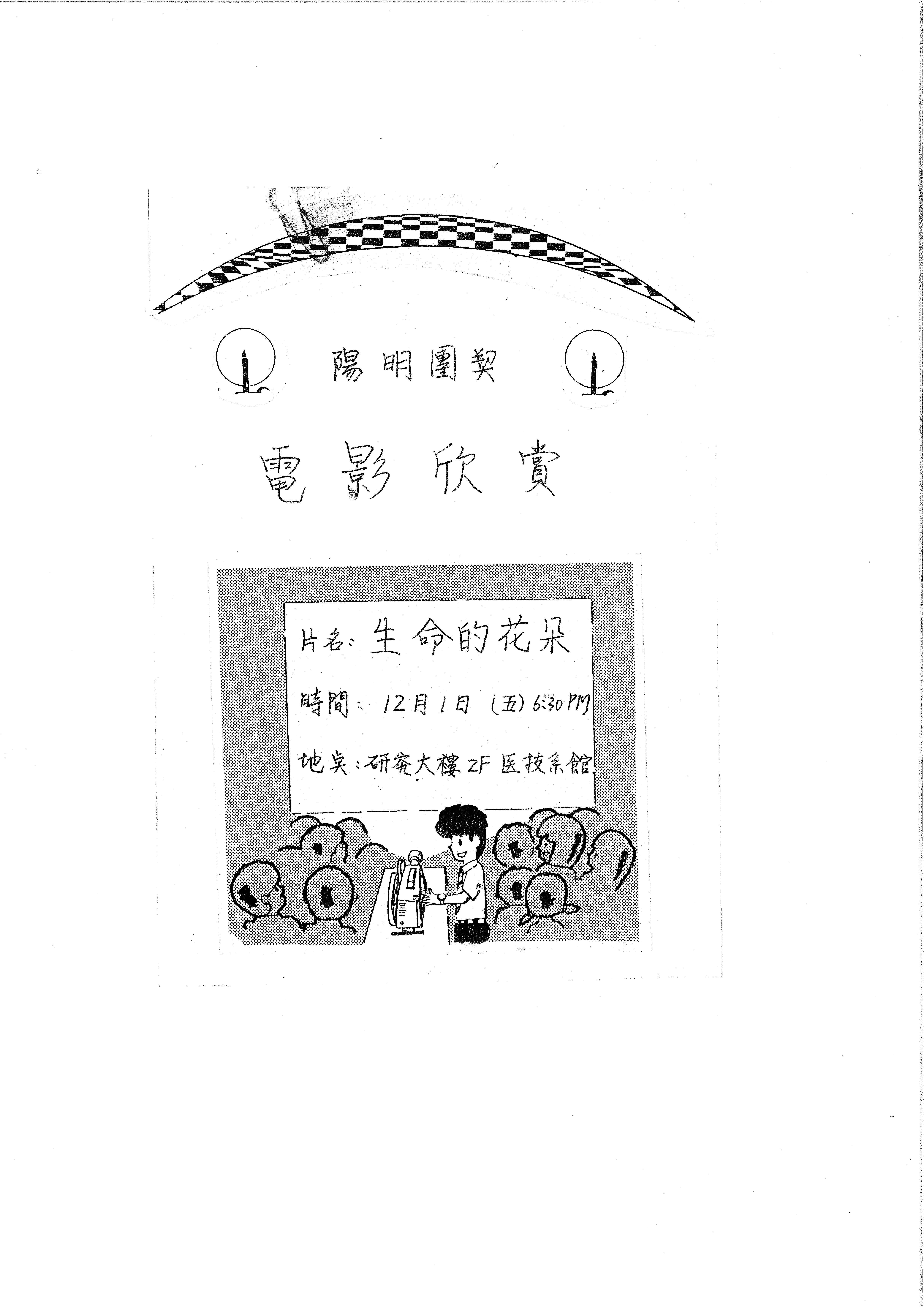 此頁為陽明團契舉辦電影欣賞活動的邀請函。活動將播放電影《生命的花朵》,並註明了時間與地點。