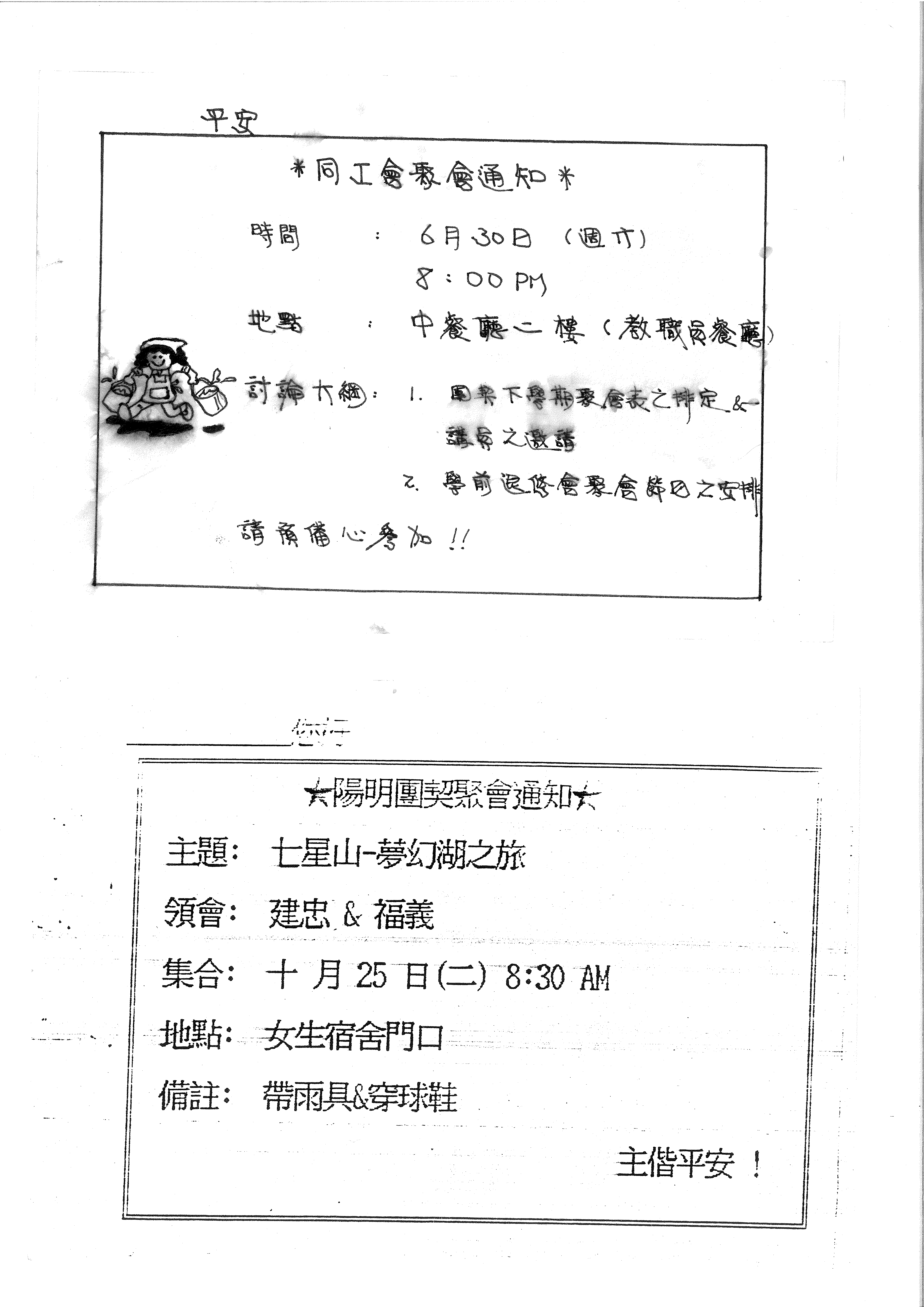 此頁包含兩份通知。第一份是同工會聚會通知,討論暑期聚會表、講員邀請及學前退修會節目安排。第二份是陽明團契的七星山-夢幻湖之旅通知,列出集合時間地點及注意事項。