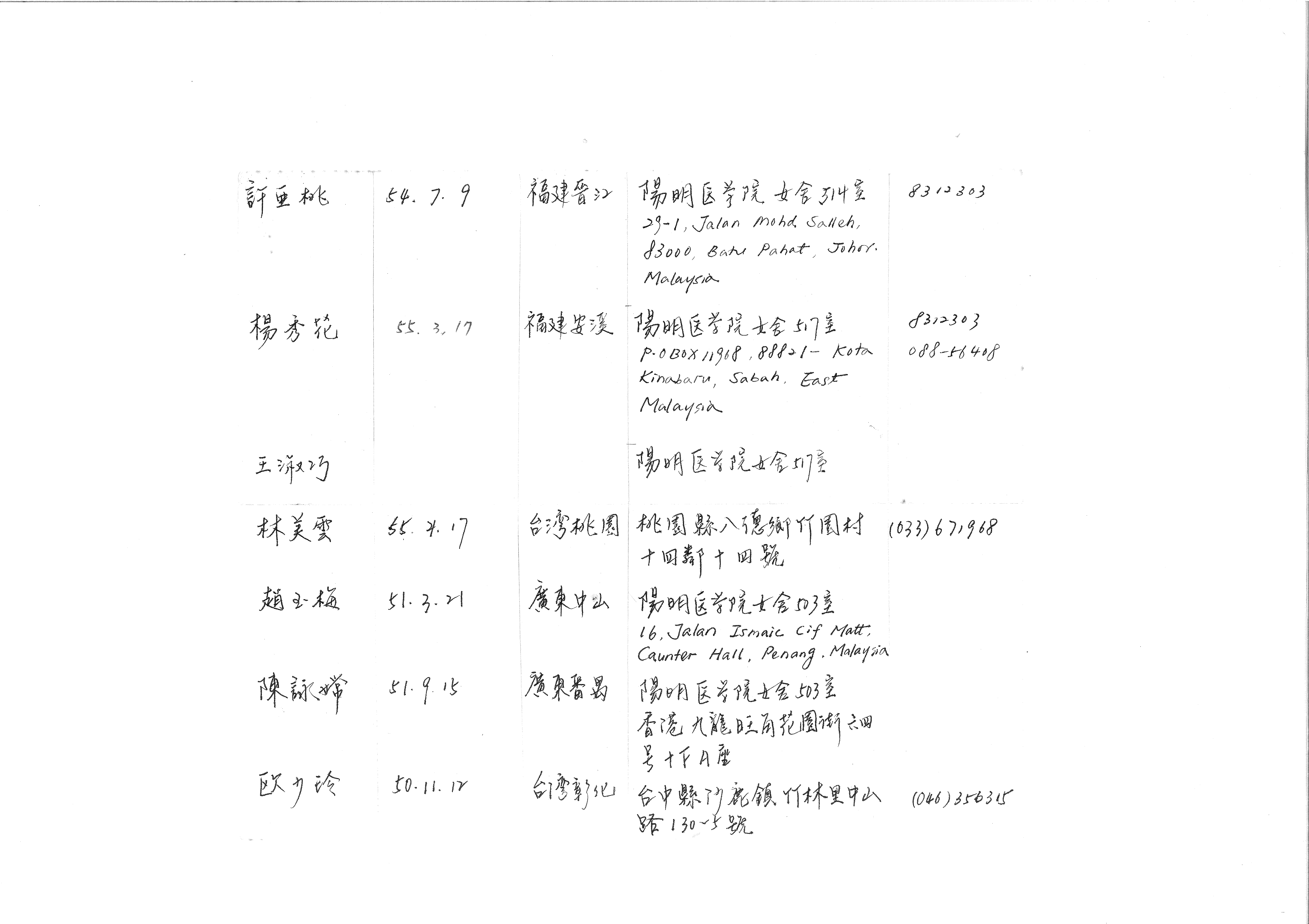 | 楊秀花 | 55. 3. 17 | 福建安溪 | 陽明医学院女舍517室 P.O.BOX 11968, 88821- Kota Kinabaru, Sabah, East Malaysia |