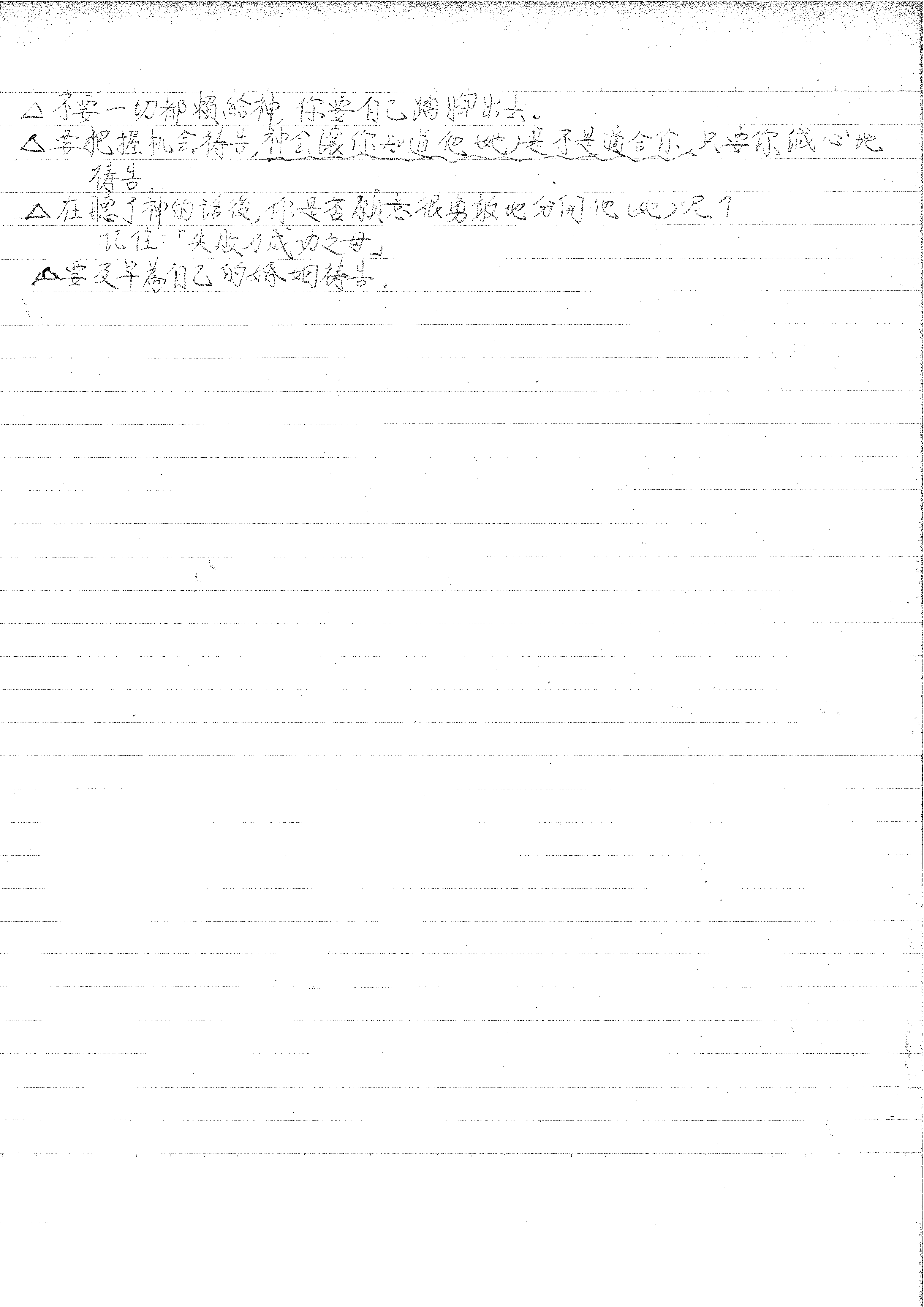 △不要一切都賴給神,你要自己將腳出去。 △要把握機會禱告,神會讓你知道他她是不是適合你,只要你誠心地 禱告 △在聽了神的話後,你是否願意很勇敢地分開他(她)呢? 記住:「失敗乃成功之母」 ▲要及早為自己的婚姻禱告。