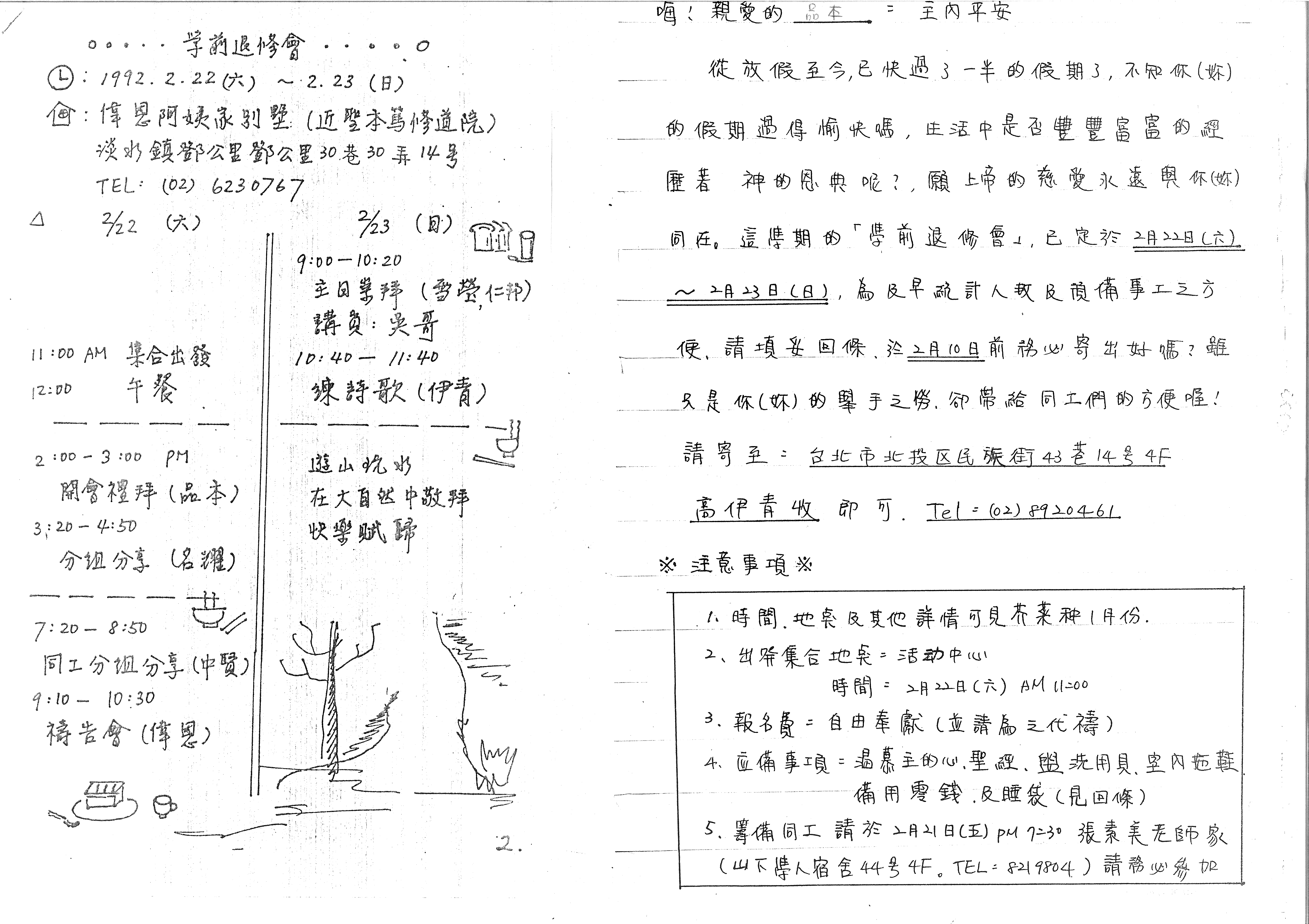 - 籌備同工請於2月21日(五) PM 7:30 張素美老師家 (山下傳人宿舍44號4F。TEL: 8219804) 請務必參加