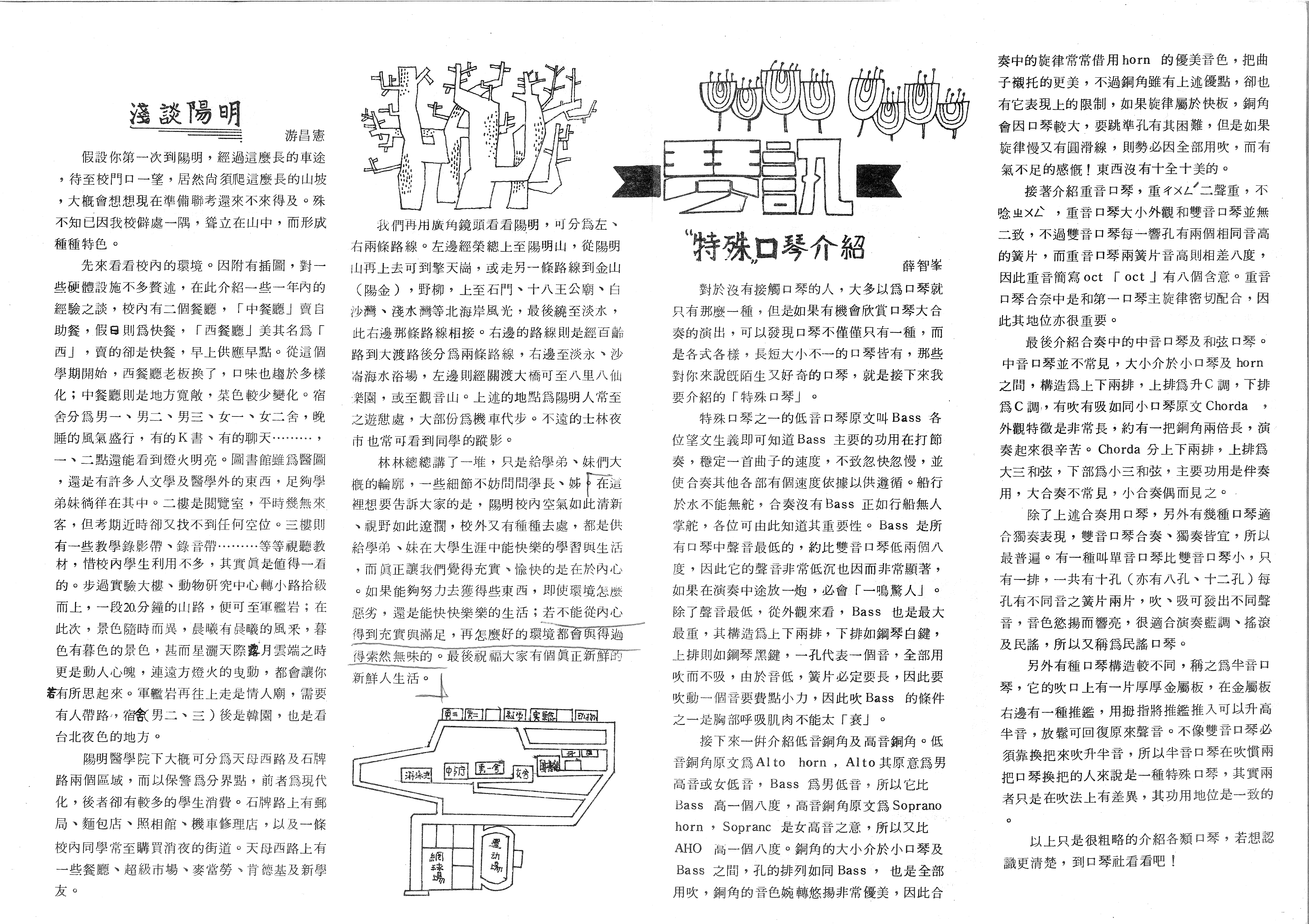 林林總總講了一堆,只是給學弟、妹們大概的輪廓,一些細節不妨問問學長、姊,在這裡想要告訴大家的是,陽明校內空氣如此清新、視野如此遼闊,校外又有種種去處,都是供給學弟、妹在大學生涯中能快樂的學習與生活,而真正讓我們覺得充實、愉快的是在於內心。如果能夠努力去獲得些東西,即使環境怎麼惡劣,還是能快快樂樂的生活;若不能從內心得到充實與滿足,再怎麼好的環境都會與得過得索然無味的。最後祝福大家有個真正新鮮的新鮮人生活。