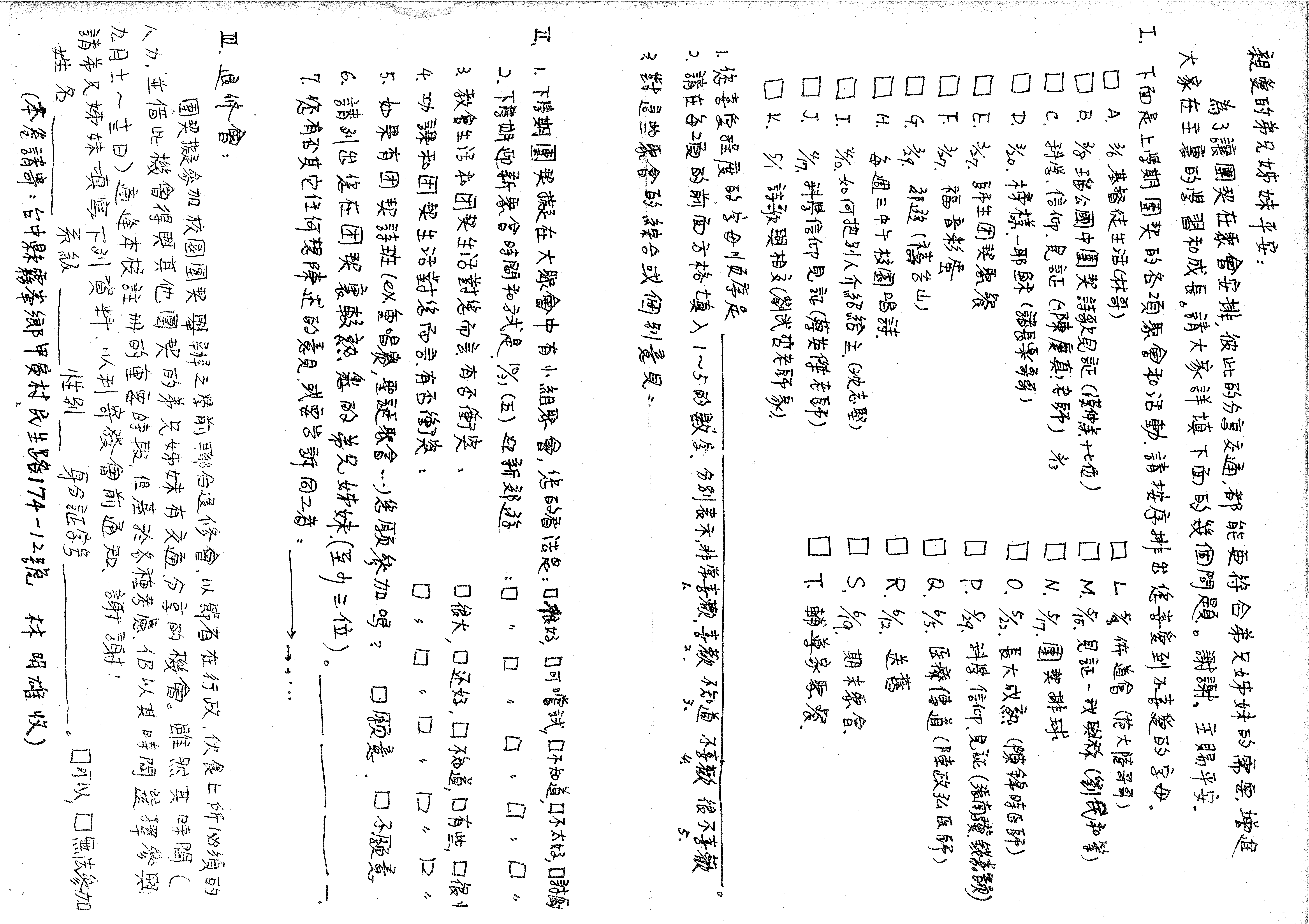 I. 下面是上學期團契的各項聚會和活動,請按序排出您喜愛到不喜愛的字母。 ☐ A. 3/6 活基督徒生活(林哥) ☐ B. 3/6 汐瑠公國中團契詩歌見証(漢仲業十七位) ☐ C. 3/13 科學、信仰、見証(陳慶真老師) ☐ D. 3/20. 榜樣—耶穌(諸長樂哥哥) ☐ E. 3/27. 師生團契聚餐 ☐ F. 3/27. 福音彩蛋 ☐ G. 3/29. 郊遊(禱告山) ☐ H. 每週三中午校園唱詩 ☐ I. 4/10. 如何把別人介紹給主。(沈志堅) ☐ J. 4/17. 科學信仰見証(蔣英傑老師) ☐ K. 5/1. 詩歌與相交(劉武变老師家) ☐ L. 4/24 佈道會(范大陸哥哥) ☐ M. 5/8. 見証—我與板(劉民和等) ☐ N. 5/17. 團契排球 ☐ O. 5/22. 長大成熟(陳錦時醫師) ☐ P. 5/29. 科學、信仰、見証(張南驥、錢嘉韻) ☐ Q. 6/5. 醫療傳道(陳政弘醫師) ☐ R. 6/12. 送舊 ☐ S. 6/19. 期末餐會 ☐ T. 輔導家聚餐
