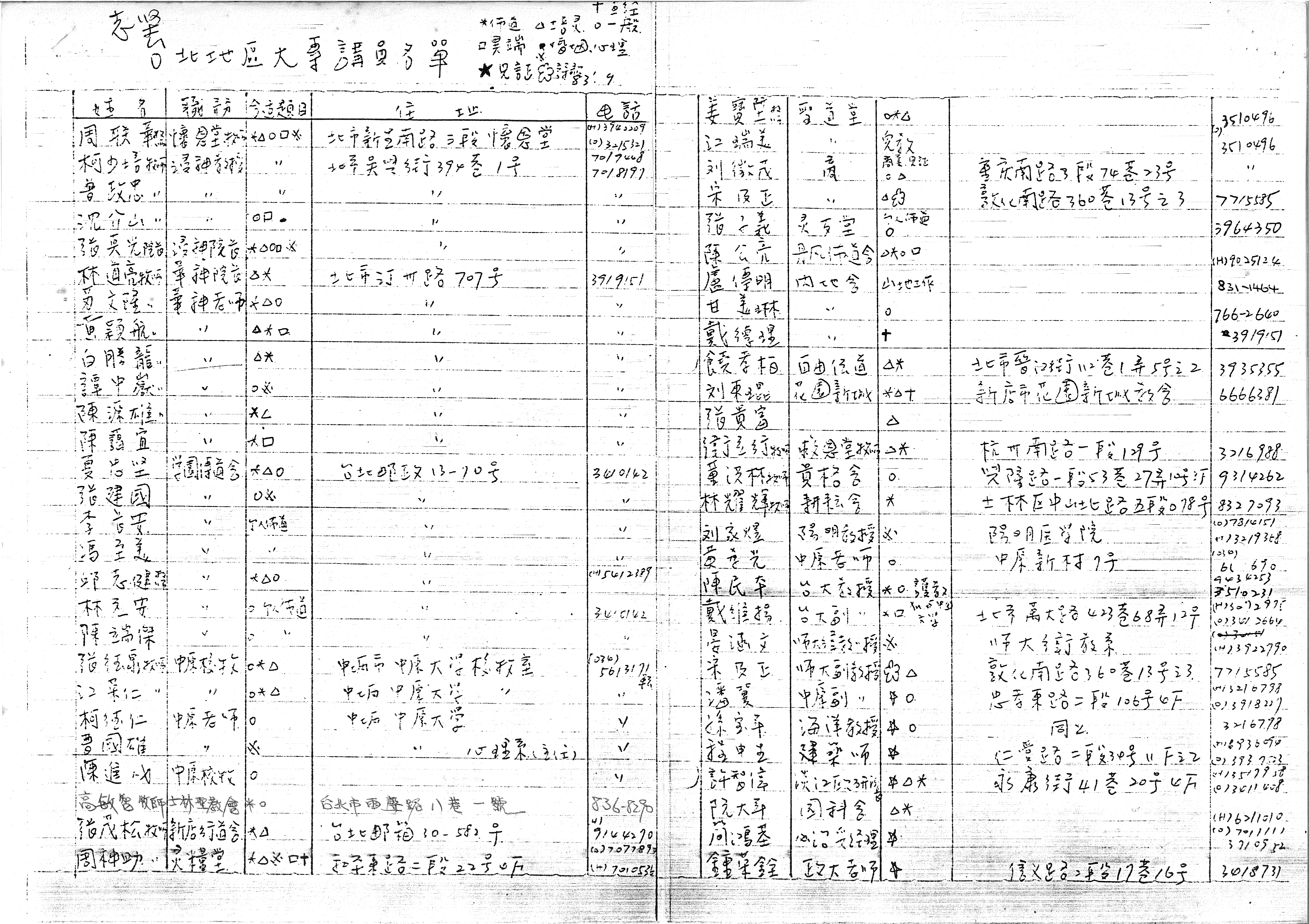 | 周神助 | 火把堂 | *△□† | 和平東路二段22号4F | (H)7010534 | 阮大年 | 國科會 | △* | (H)6211010 | |