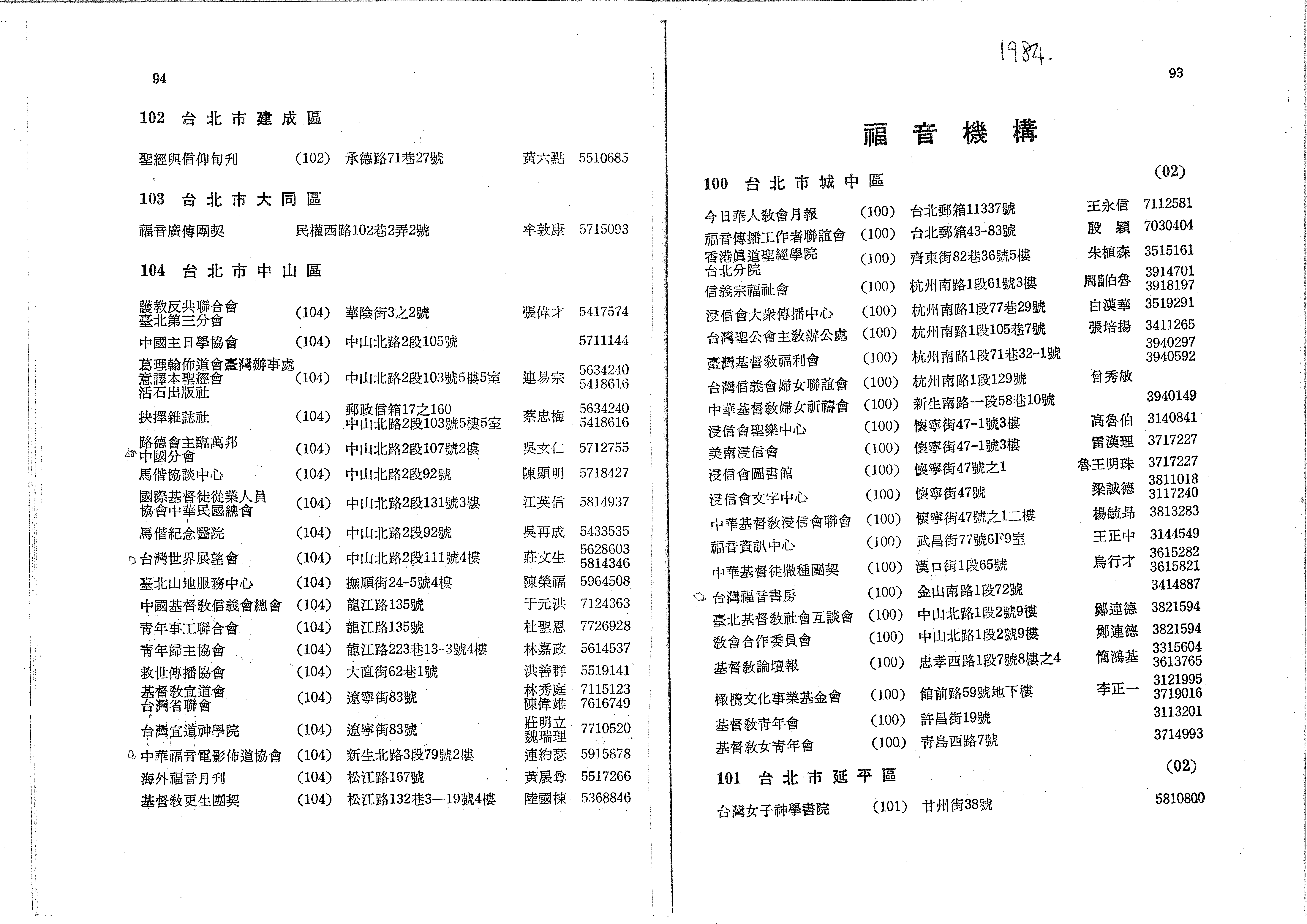 今日華人教會月報 (100) 台北郵箱11337號 王永信 7112581 福音傳播工作者聯誼會 (100) 台北郵箱43-83號 殷穎 7030404 香港眞道聖經學院 台北分院 (100) 齊東街82巷36號5樓 朱植森 3515161 信義宗福祉會 (100) 杭州南路1段61號3樓 周蕭伯魯 3914701 3918197 浸信會大眾傳播中心 (100) 杭州南路1段77巷29號 白漢華 3519291 台灣聖公會主教辦公處 (100) 杭州南路1段105巷7號 張培揚 3411265 臺灣基督教福利會 (100) 杭州南路1段71巷32-1號 3940297 3940592 台灣信義會婦女聯誼會 (100) 杭州南路1段129號 曾秀敏 中華基督教婦女祈禱會 (100) 新生南路一段58巷10號 3940149 浸信會聖樂中心 (100) 懷寧街47-1號3樓 高魯伯 3140841 美南浸信會 (100) 懷寧街47-1號3樓 雷漢理 3717227 浸信會圖書館 (100) 懷寧街47號之1 魯王明珠 3717227 3811018 浸信會文字中心 (100) 懷寧街47號 梁誠德 3117240 中華基督教浸信會聯會 (100) 懷寧街47號之1二樓 楊毓昻 3813283 福音資訊中心 (100) 武昌街77號6F9室 王正中 3144549 3615282 中華基督徒撒種團契 (100) 漢口街1段65號 烏行才 3615821 ◇台灣福音書房 (100) 金山南路1段72號 3414887 臺北基督教社會互談會 (100) 中山北路1段2號9樓 鄭連德 3821594 教會合作委員會 (100) 中山北路1段2號9樓 鄭連德 3821594 基督教論壇報 (100) 忠孝西路1段7號8樓之4 簡鴻基 3315604 3613765 橄欖文化事業基金會 (100) 館前路59號地下樓 李正一 3121995 3719016 基督教青年會 (100) 許昌街19號 3113201 基督教女青年會 (100) 青島西路7號 3714993