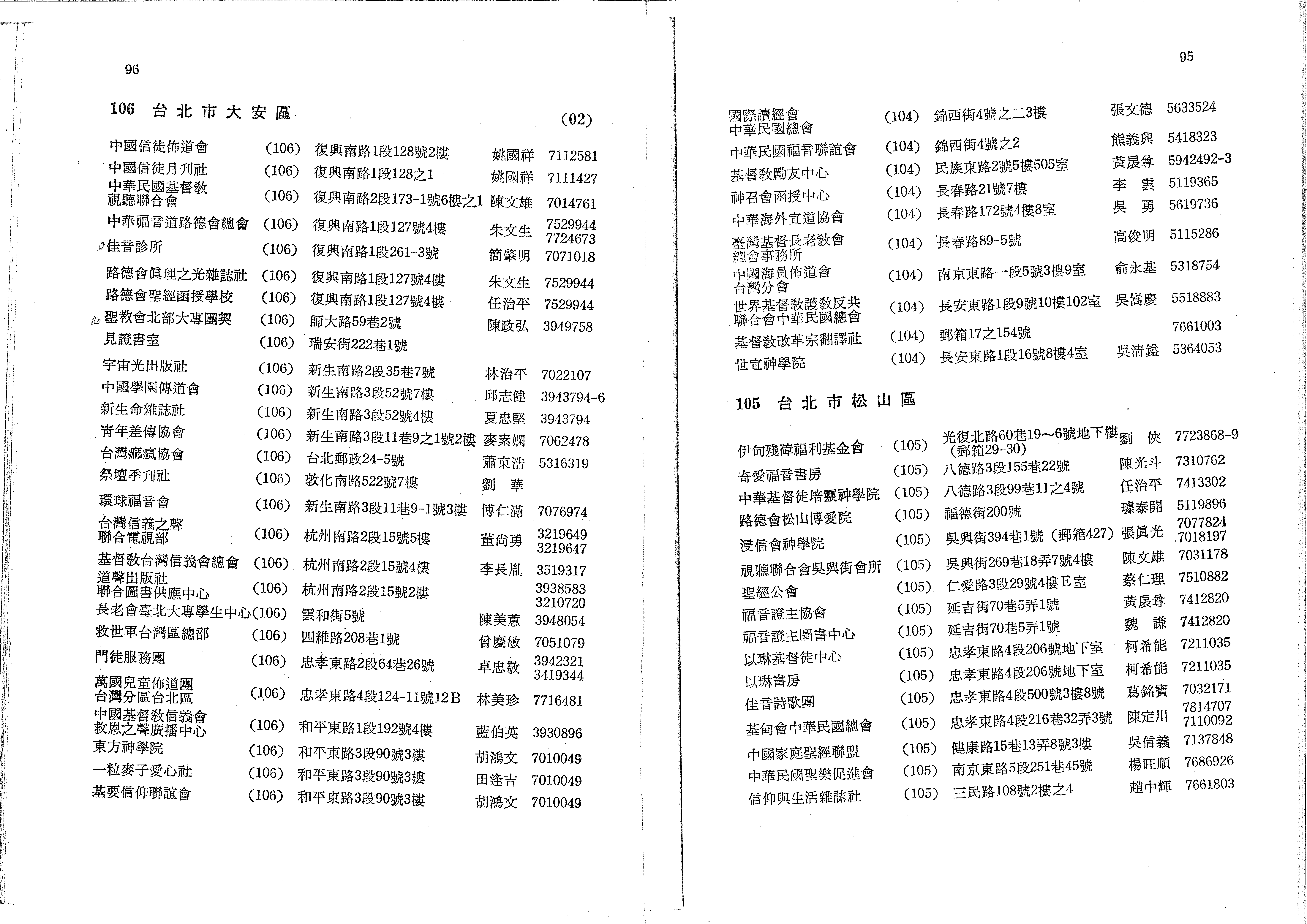 95 (02) 國際讀經會 中華民國總會 (104) 錦西街4號之二3樓 張文德 5633524 中華民國福音聯誼會 (104) 錦西街4號之2 熊義興 5418323 基督教勵友中心 (104) 民族東路2號5樓505室 黃展奪 5942492-3 神召會函授中心 (104) 長春路21號7樓 李雲 5119365 中華海外宣道協會 (104) 長春路172號4樓8室 吳勇 5619736 臺灣基督長老教會 總會事務所 (104) 長春路89-5號 高俊明 5115286 中國海員佈道會 台灣分會 (104) 南京東路一段5號3樓9室 俞永基 5318754 世界基督教護教反共 聯合會中華民國總會 (104) 長安東路1段9號10樓102室 吳嵩慶 5518883 基督教改革宗翻譯社 (104) 郵箱17之154號 7661003 世宣神學院 (104) 長安東路1段16號8樓4室 吳清鎰 5364053