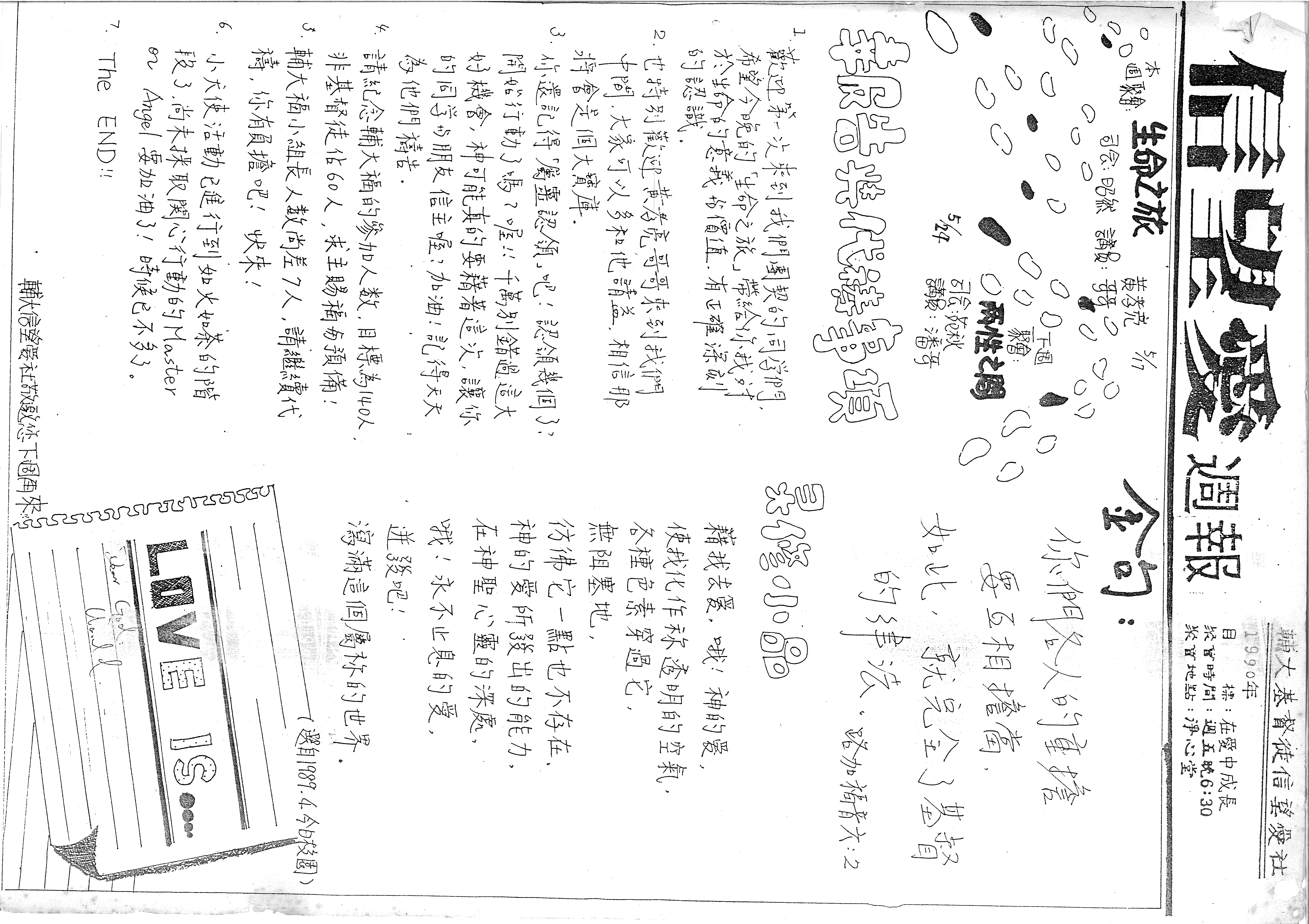 輔大基督徒信望愛社 1990年 目標:在愛中成長 聚會時間:週五晚6:30 聚會地點:淨心堂