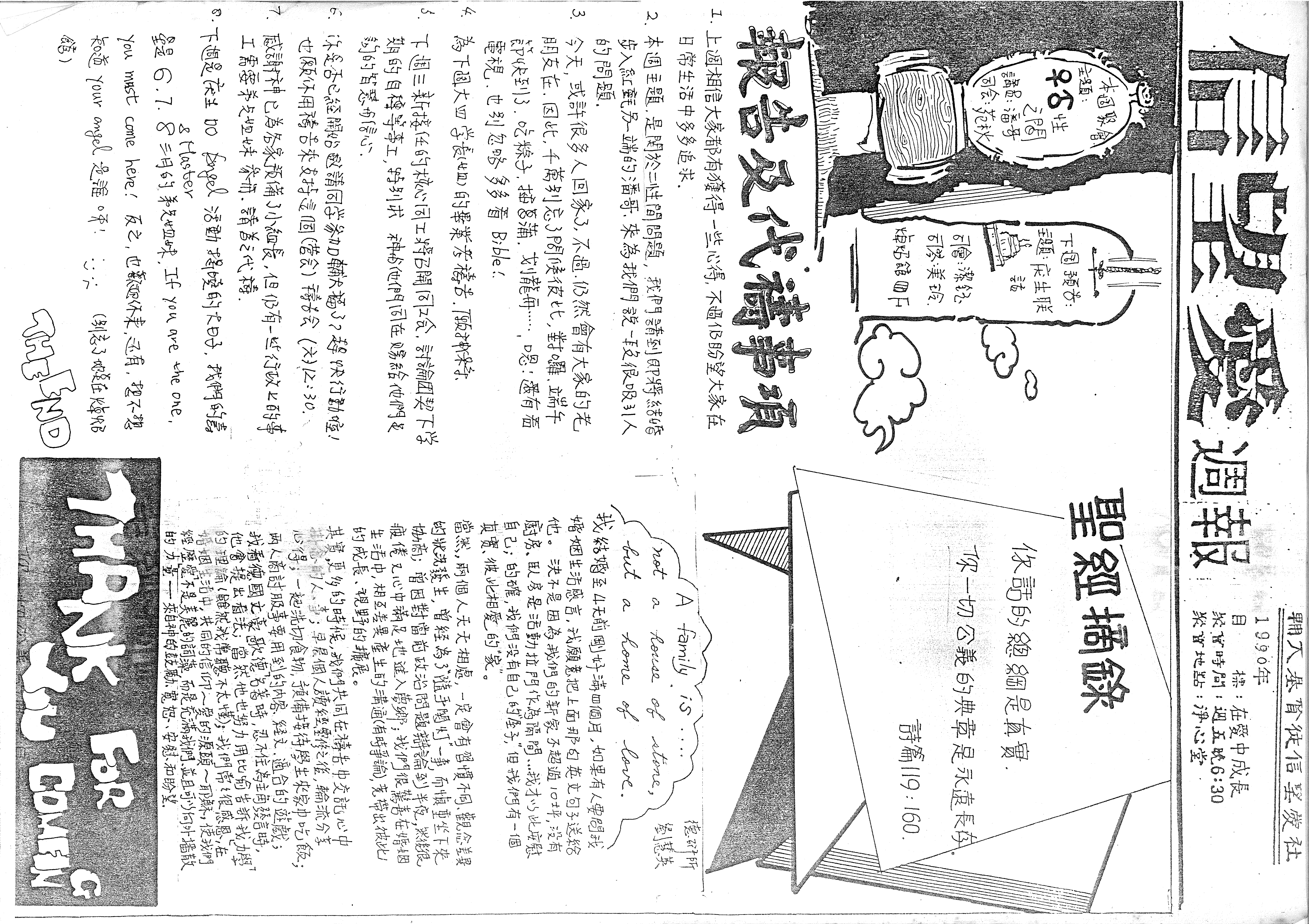[圖:左上角有一木桶及鏡子,鏡中文字為「主題: ♂♀之間 司會: 范秋 司琴: 美玲 地點: 淨心堂」。其下有一塔及劍,文字為「下週預告: 主題: 庆生联欢 地點: 焯炤館四F」。]