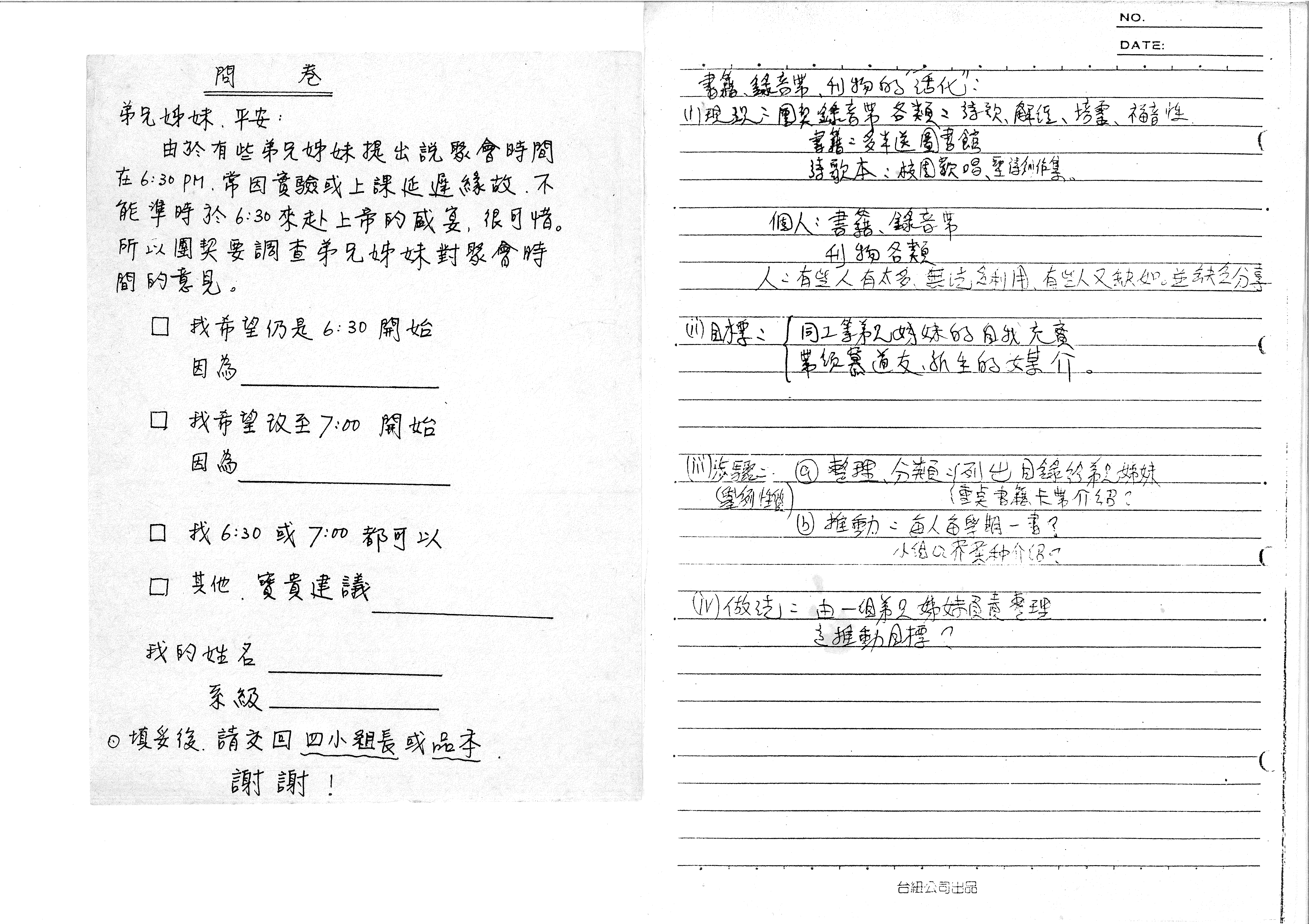 由於有些弟兄姊妹提出說聚會時間在 6:30 PM、常因實驗或上課延遲緣故,不能準時於 6:30 來赴上帝的盛宴,很可惜。所以團契要調查弟兄姊妹對聚會時間的意見。