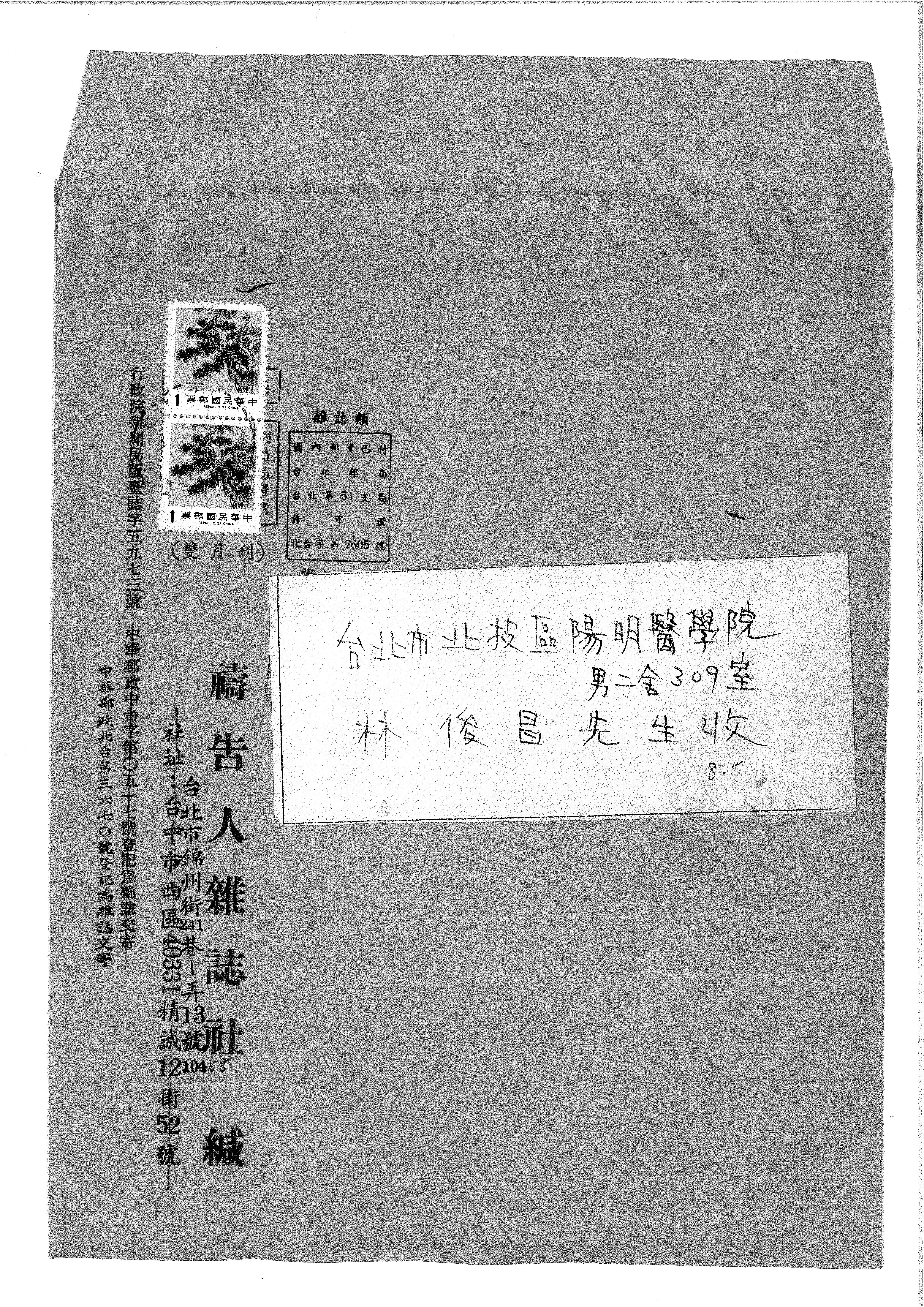 台北市北投區陽明醫學院 男二舍309室 林俊昌先生收 8.-