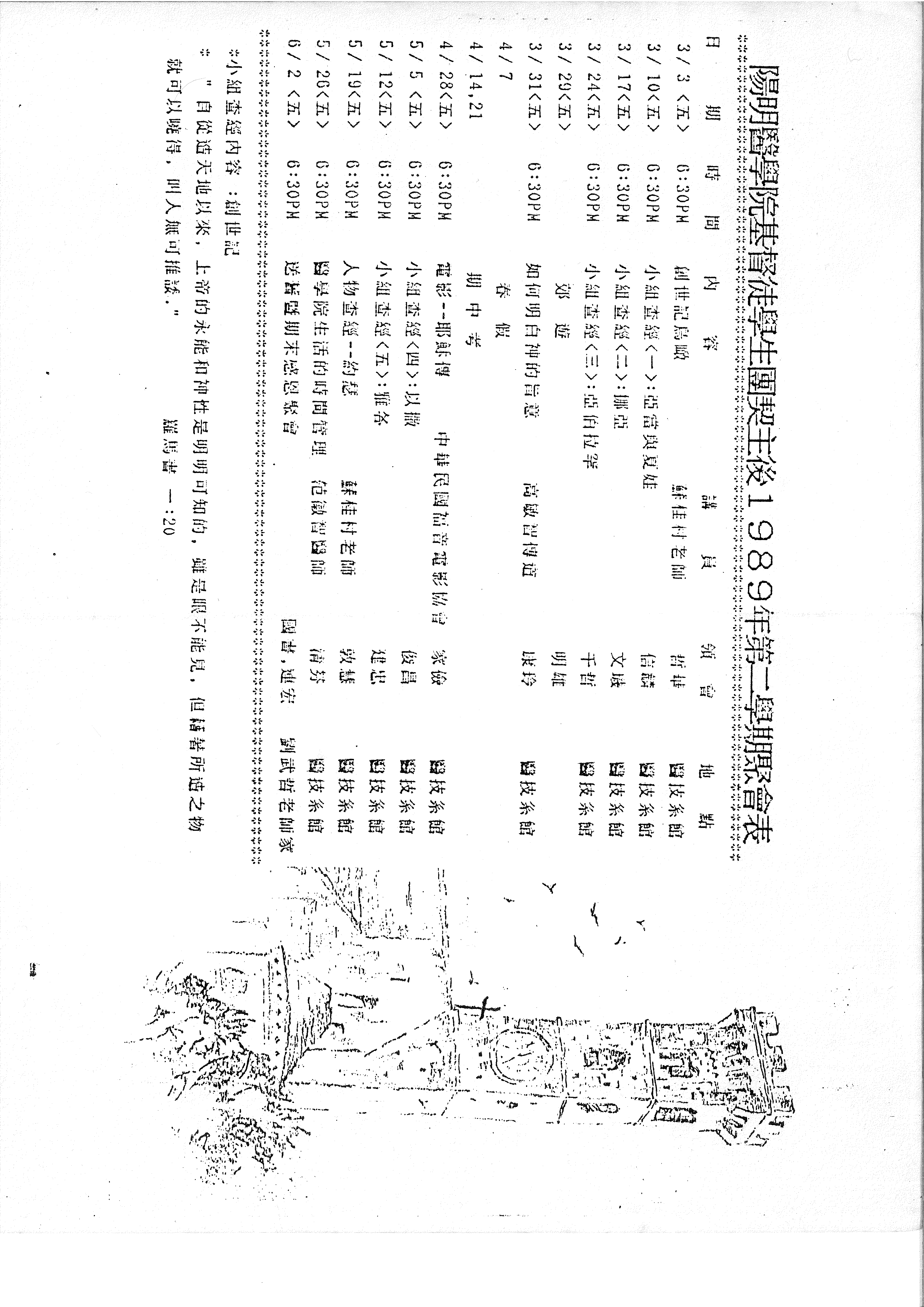 陽明醫學院基督徒學生團契主後1989年第二學期聚會表