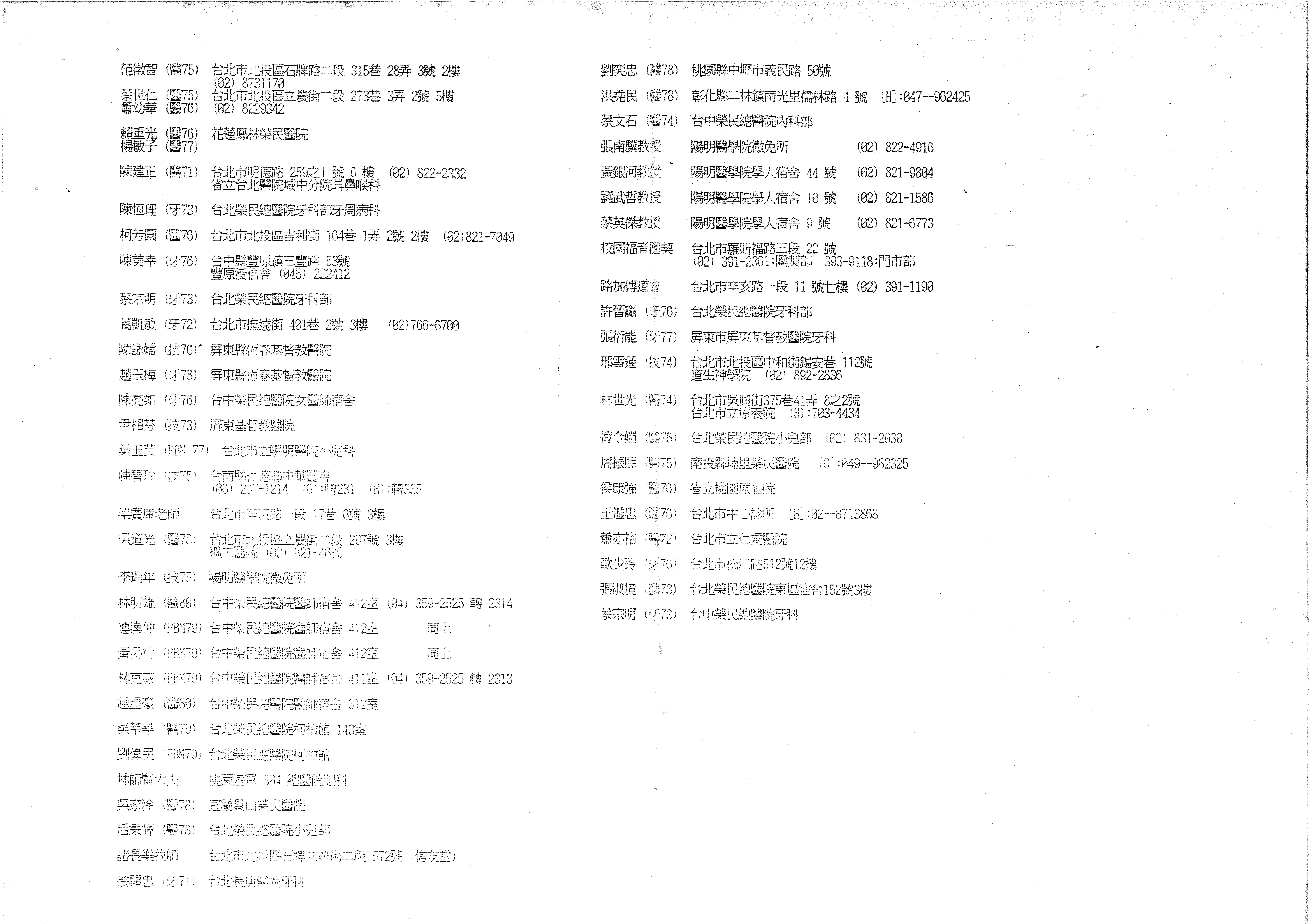 | 范微智(醫75) 台北市北投區石牌路二段315巷28弄3號2樓 (02) 8731170 | 劉奕忠(醫78) 桃園縣中壢市義民路50號 |