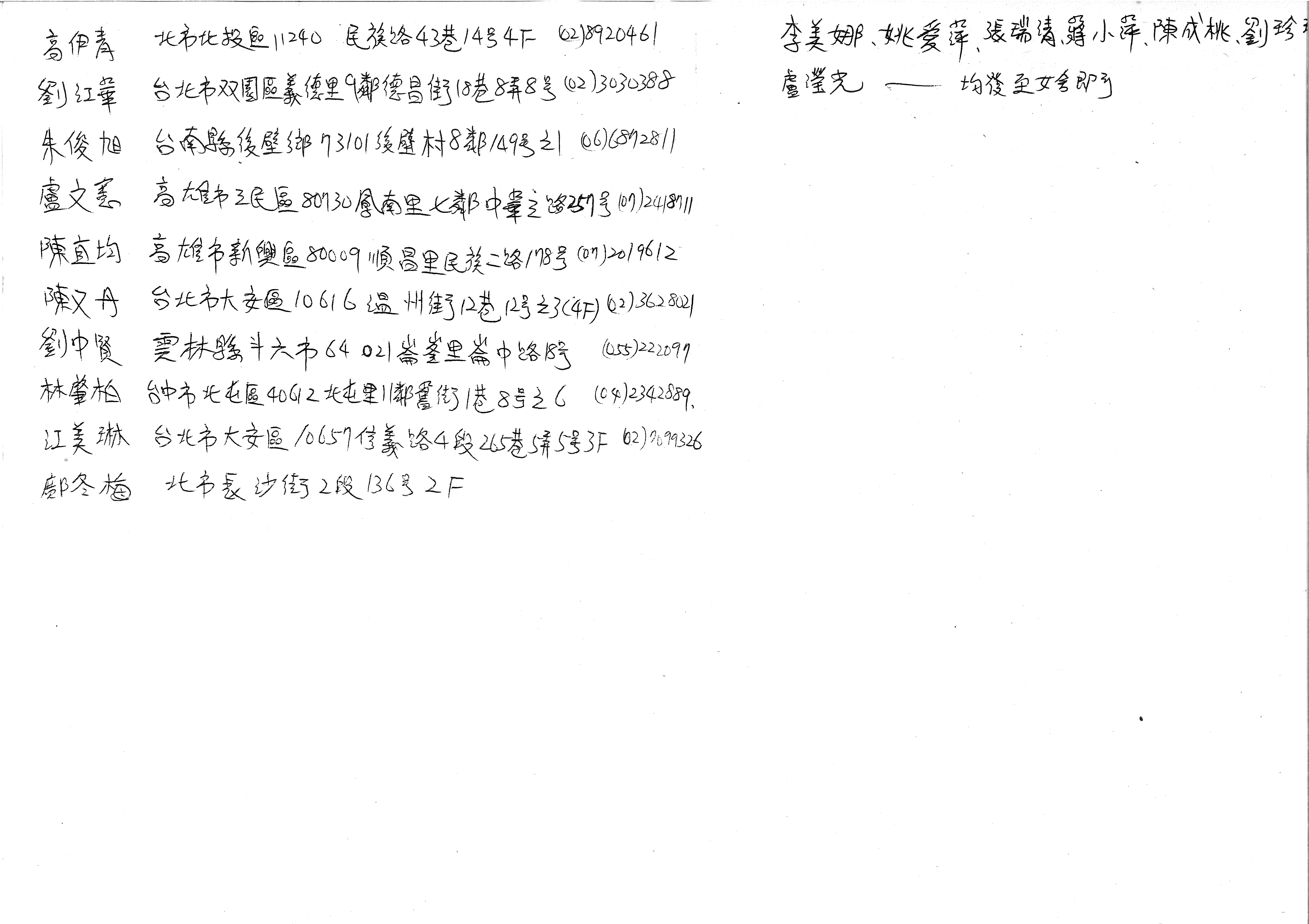 高伊青 北市北投區11240 民族路43巷14號4F (02)8920461 劉江華 台北市雙園區義德里9鄰德昌街18巷8弄8號 (02)3030388 朱俊旭 台南縣後壁鄉73101後壁村8鄰149號之1 (06)6872811 盧文豪 高雄市三民區80730鳳南里七鄰中華三路257號 (07)2418911 陳宜均 高雄市新興區80009順昌里民族二路178號 (07)2019612 陳又丹 台北市大安區10616溫州街12巷12號之3(4F) (02)3628021 劉中賢 雲林縣斗六市64021崙峯里崙中路18號 (055)222099 林肇柏 台中市北屯區40612北屯里11鄰舊街1巷8號之6 (04)2342889, 江美琳 台北市大安區10657信義路4段265巷5弄5號3F (02)27099326 鄭冬梅 北市長沙街2段136號2F