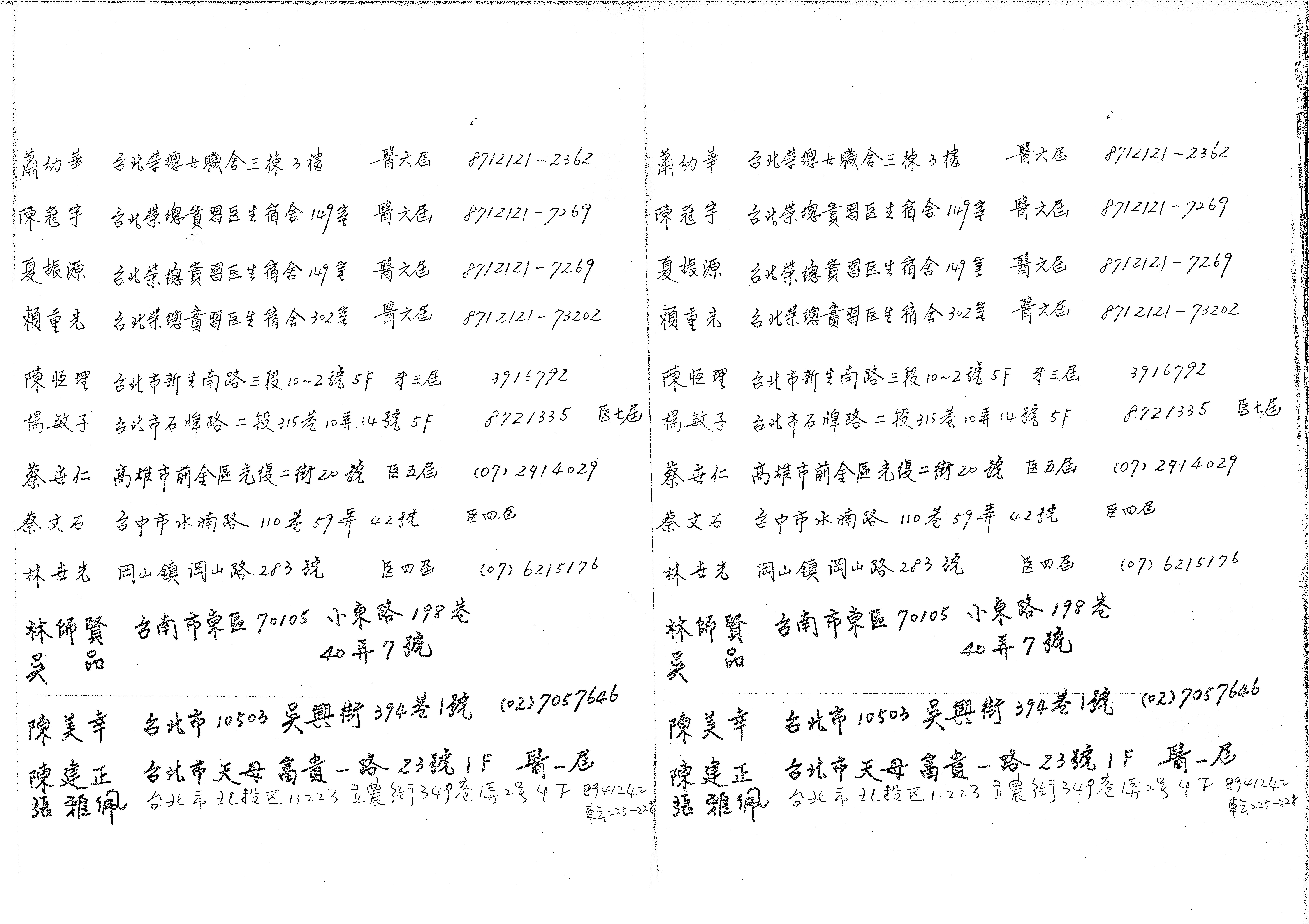 蕭幼華 台北榮總女職宿三棟3樓 醫六屆 8712121-2362 陳冠宇 台北榮總實習医生宿舍149室 醫六屆 8712121-7269 夏振源 台北榮總實習医生宿舍149室 醫六屆 8712121-7269 賴重光 台北榮總實習医生宿舍302室 醫六屆 8712121-73202 陳恆理 台北市新生南路三段10-2號5F 牙三屆 3916792 楊敏子 台北市石牌路二段315巷10弄14號5F 8721335 医七屆 蔡安仁 高雄市前金區光復二街20號 医五屆 (07)2914029 蔡文石 台中市水湳路110巷59弄42號 医四屆 林吉光 岡山鎮岡山路283號 医四屆 (07)6215176 林師賢 台南市東區70105 小東路198巷 40弄7號 吳品 陳美幸 台北市10503 吳興街394巷1號 (02)7057646 陳建正 台北市天母富貴一路23號1F 醫一屆 張雅佩 台北市北投区11223 立農街349巷1弄2号4F 8941242 轉225-228