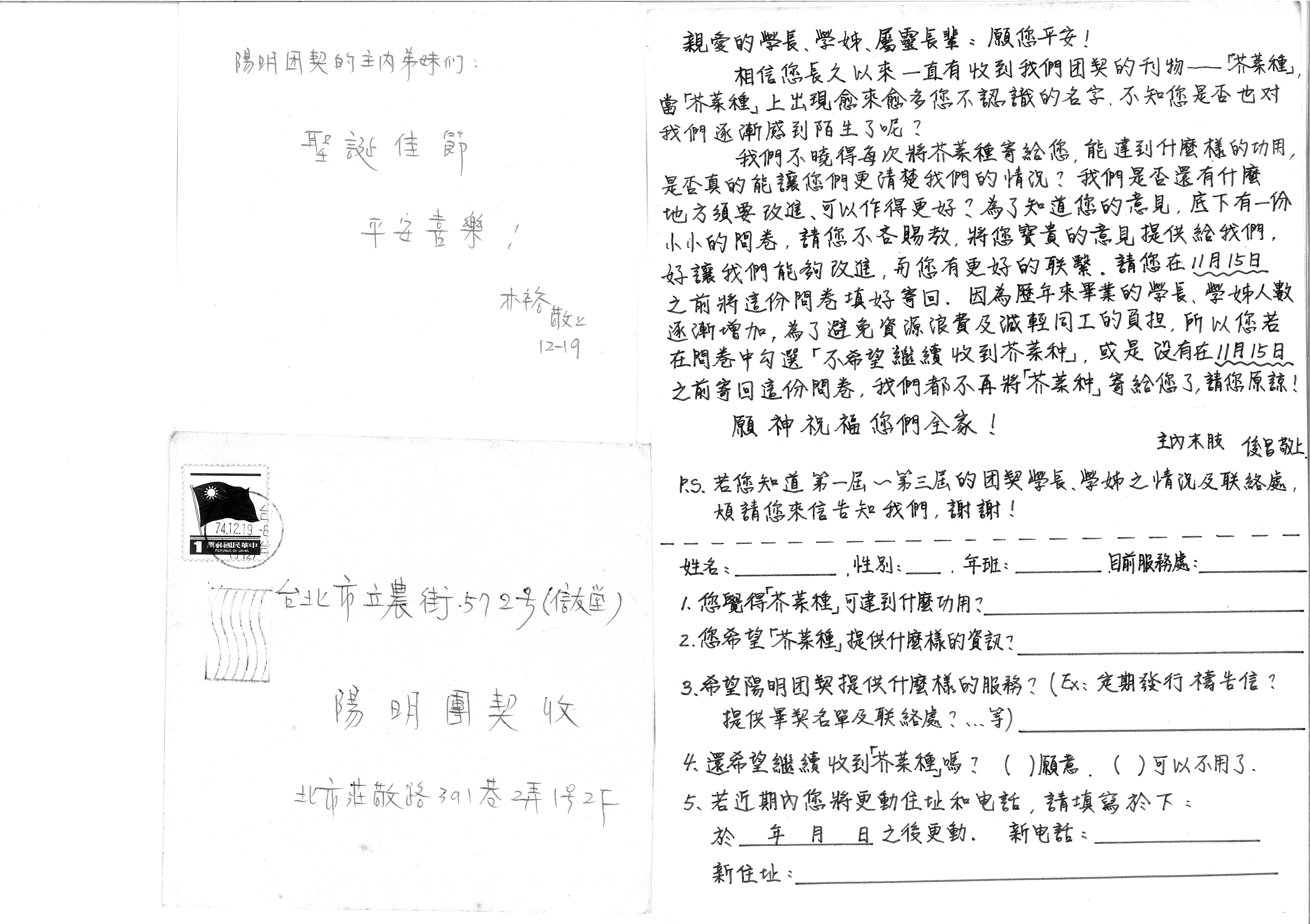 P.S. 若您知道第一屆~第三屆的團契學長、學姊之情況及聯絡處,煩請您來信告知我們,謝謝!