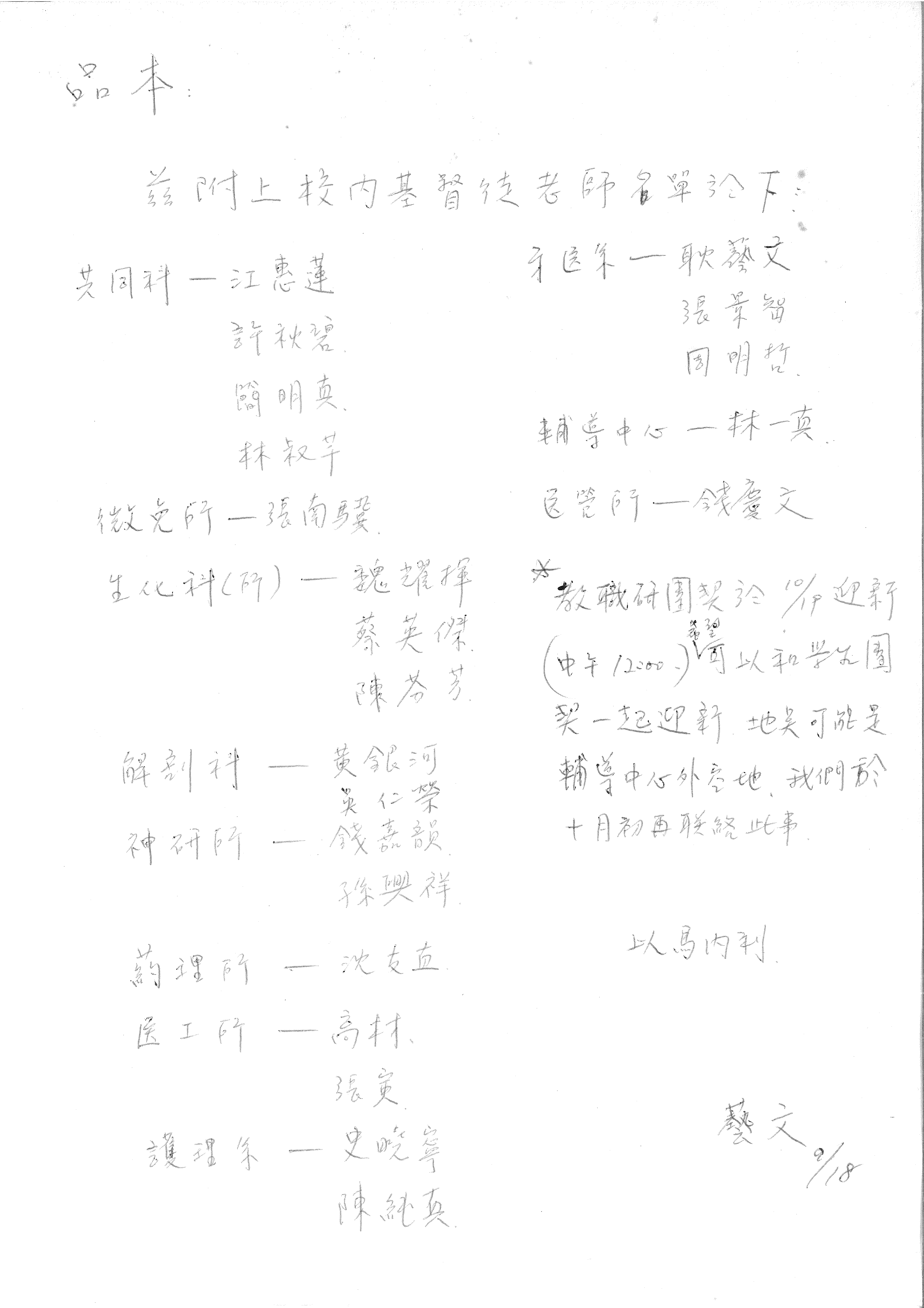 *教職研習會於 9/26 迎新 (中午12:00) 可以和學園團契一起迎新,地奌可能是輔導中心外草地,我們於十月初再聯絡此事。