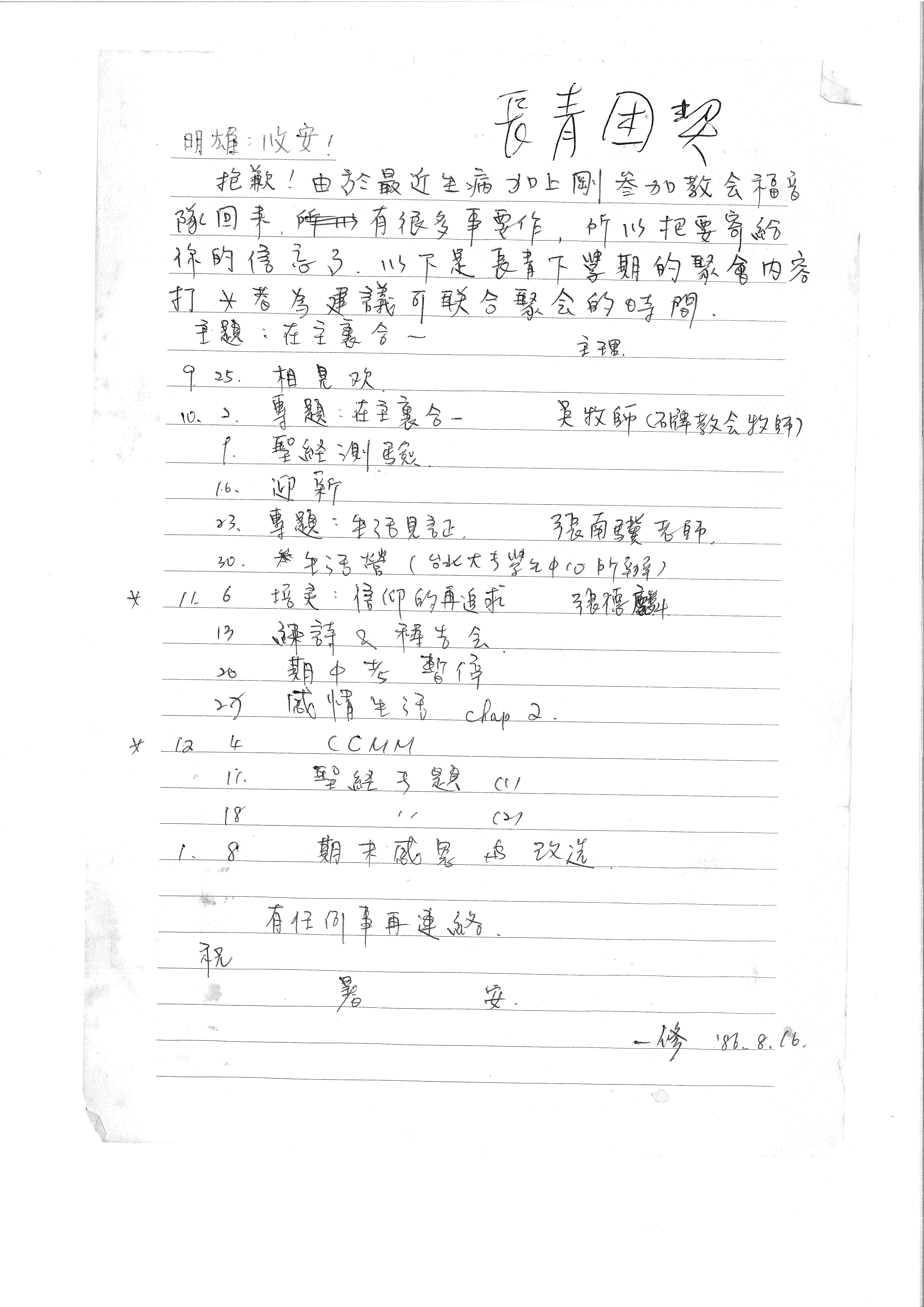抱歉!由於最近生病加上剛參加教會福音隊回來,所以有很多事要作,所以把要寄給你的信忘了。以下是長青下學期的聚會內容,打 * 者為建議可聯合聚會的時間。 主題:在主裏合一 主理