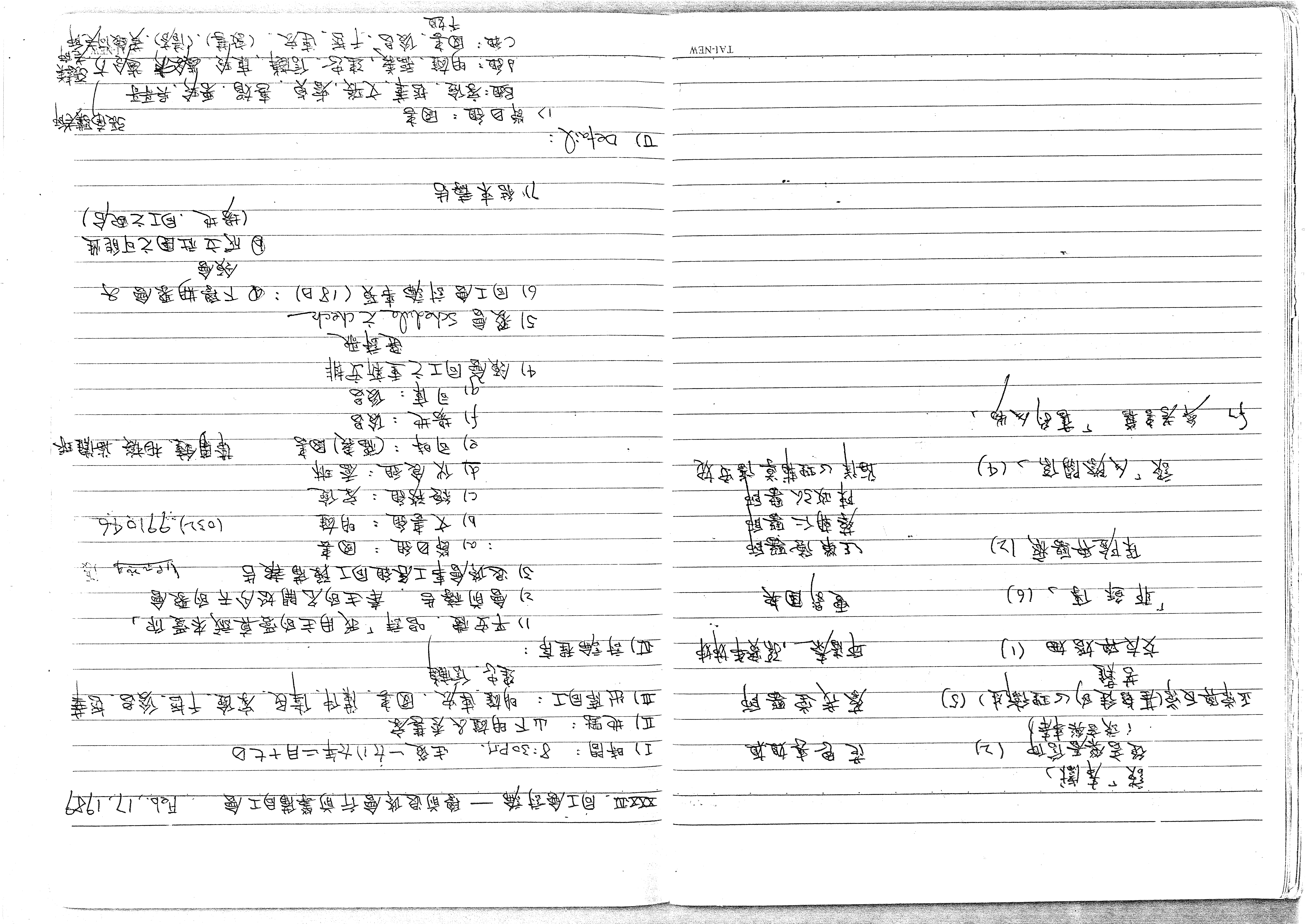 Ⅰ) 時間: 8:30PM. 主後一九八九年二月十七日 Ⅱ) 地點: 山下明雄&秀慧家 Ⅲ) 出席同工: 明雄、連宏、國書、廣仲、偉民、家儉、千色、俊昌、哲章、 邱清華, 孫實事姊姊 Ⅳ) 討論程序: